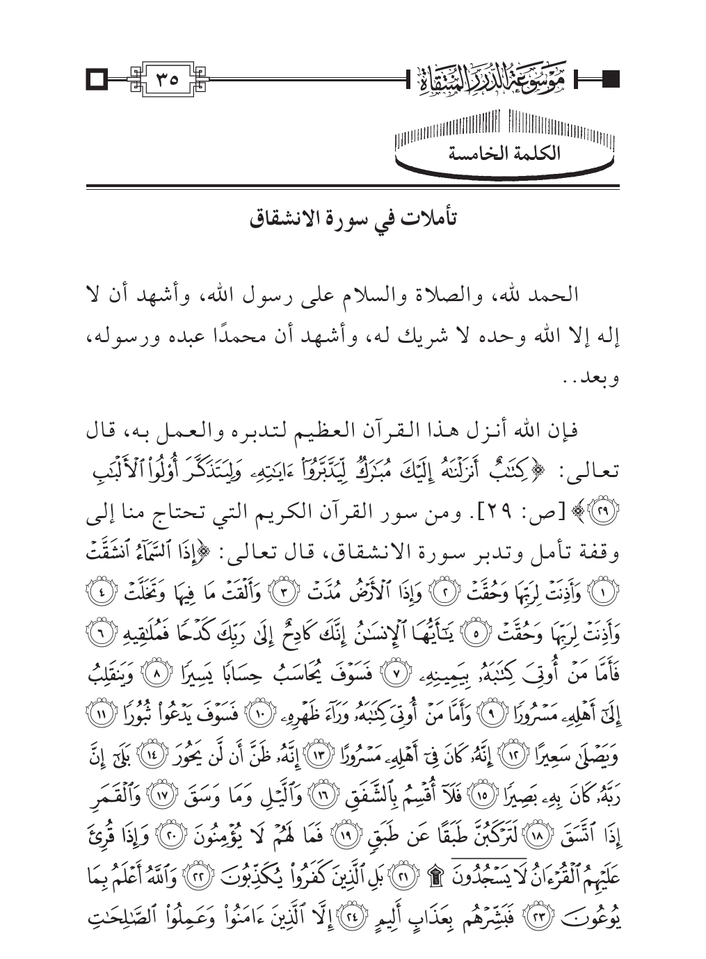 فإن الله أنزل هذا القرآن العظيم لتدبره والعمل به، قال تعالى: {كِتَابٌ أَنْزَلْنَاهُ إِلَيْكَ مُبَارَكٌ لِيَدَّبَّرُوا آيَاتِهِ وَلِيَتَذَكَّرَ أُولُو الْأَلْبَابِ (٢٩)} [ص: ٢٩]. ومن سور القرآن الكريم التي تحتاج منا إلى وقفة تأمل وتدبر سورة الانشقاق، قال تعالى: {إِذَا السَّمَاءُ انْشَقَّتْ (١) وَأَذِنَتْ لِرَبِّهَا وَحُقَّتْ (٢) وَإِذَا الْأَرْضُ مُدَّتْ (٣) وَأَلْقَتْ مَا فِيهَا وَتَخَلَّتْ (٤) وَأَذِنَتْ لِرَبِّهَا وَحُقَّتْ (٥) يَاأَيُّهَا الْإِنْسَانُ إِنَّكَ كَادِحٌ إِلَى رَبِّكَ كَدْحًا فَمُلَاقِيهِ (٦) فَأَمَّا مَنْ أُوتِيَ كِتَابَهُ بِيَمِينِهِ (٧) فَسَوْفَ يُحَاسَبُ حِسَابًا يَسِيرًا (٨) وَيَنْقَلِبُ إِلَى أَهْلِهِ مَسْرُورًا (٩) وَأَمَّا مَنْ أُوتِيَ كِتَابَهُ وَرَاءَ ظَهْرِهِ (١٠) فَسَوْفَ يَدْعُو ثُبُورًا (١١) وَيَصْلَى سَعِيرًا (١٢) إِنَّهُ كَانَ فِي أَهْلِهِ مَسْرُورًا (١٣) إِنَّهُ ظَنَّ أَنْ لَنْ يَحُورَ (١٤) بَلَى إِنَّ رَبَّهُ كَانَ بِهِ بَصِيرًا (١٥) فَلَا أُقْسِمُ بِالشَّفَقِ (١٦) وَاللَّيْلِ وَمَا وَسَقَ (١٧) وَالْقَمَرِ إِذَا اتَّسَقَ (١٨) لَتَرْكَبُنَّ طَبَقًا عَنْ طَبَقٍ (١٩) فَمَا لَهُمْ لَا يُؤْمِنُونَ (٢٠) وَإِذَا قُرِئَ عَلَيْهِمُ الْقُرْآنُ لَا يَسْجُدُونَ (٢١) بَلِ الَّذِينَ كَفَرُوا يُكَذِّبُونَ (٢٢) وَاللَّهُ أَعْلَمُ بِمَا يُوعُونَ (٢٣) فَبَشِّرْهُمْ بِعَذَابٍ أَلِيمٍ (٢٤) إِلَّا الَّذِينَ آمَنُوا وَعَمِلُوا الصَّالِحَاتِ