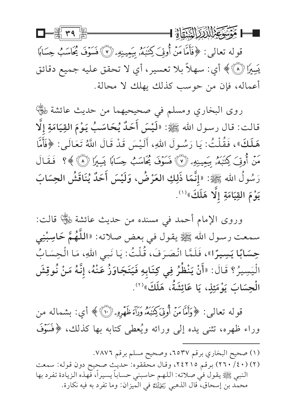 وروى الإمام أحمد في مسنده من حديث عائشة - رضي الله عنها - قالت: سمعت رسول الله - صلى الله عليه وسلم - يقول في بعض صلاته: «اللَّهُمَّ حَاسِبْنِي حِسَابًا يَسِيرًا»، فَلَمَّا انْصَرَفَ، قُلْتُ: يَا نَبي اللهِ، مَا الْحِسَابُ الْيَسِيرُ؟ قَالَ: «أَنْ يَنْظُرُ فِي كِتَابِهِ فَيَتَجَاوَزُ عَنْهُ، إِنَّهُ مَنْ نُوقِشَ الْحِسَابَ يَوْمَئِذٍ، يَا عَائِشَةُ، هَلَكَ» (¬٢).