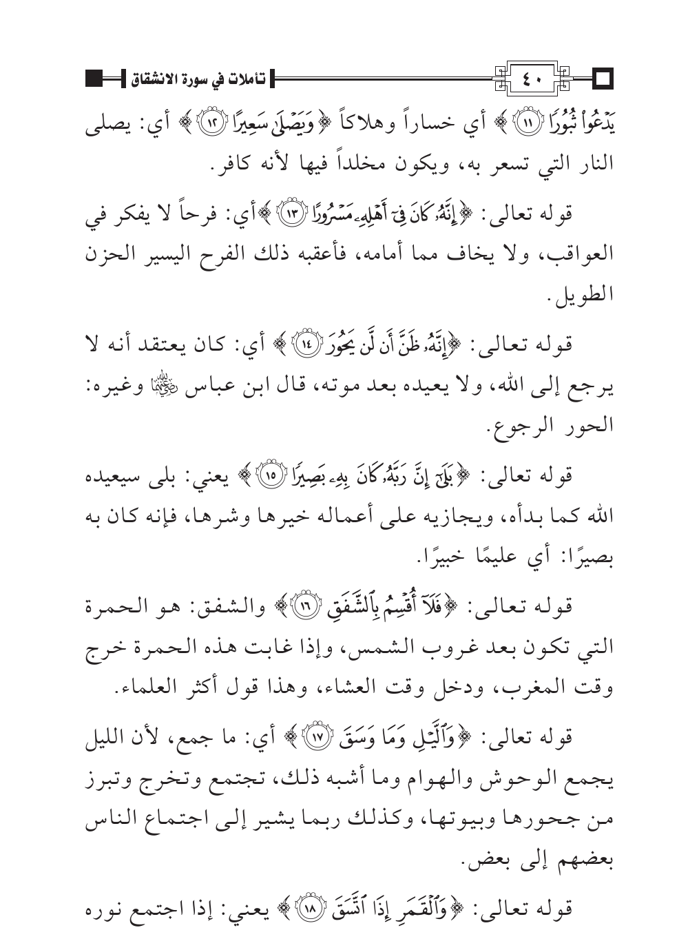 يَدْعُو ثُبُورًا (١١)} أي خساراً وهلاكاً {وَيَصْلَى سَعِيرًا (١٢)} أي: يصلى النار التي تسعر به، ويكون مخلداً فيها لأنه كافر.