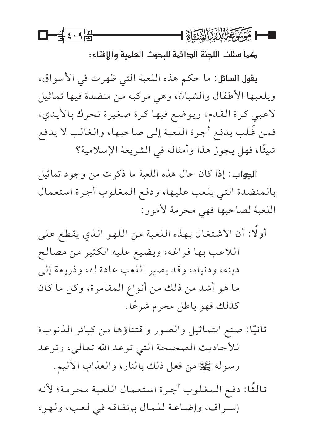 يقول السائل: ما حكم هذه اللعبة التي ظهرت في الأسواق، ويلعبها الأطفال والشبان، وهي مركبة من منضدة فيها تماثيل لاعبي كرة القدم، ويوضع فيها كرة صغيرة تحرك بالأيدي، فمن غُلب يدفع أجرة اللعبة إلى صاحبها، والغالب لا يدفع شيئًا، فهل يجوز هذا وأمثاله في الشريعة الإسلامية؟