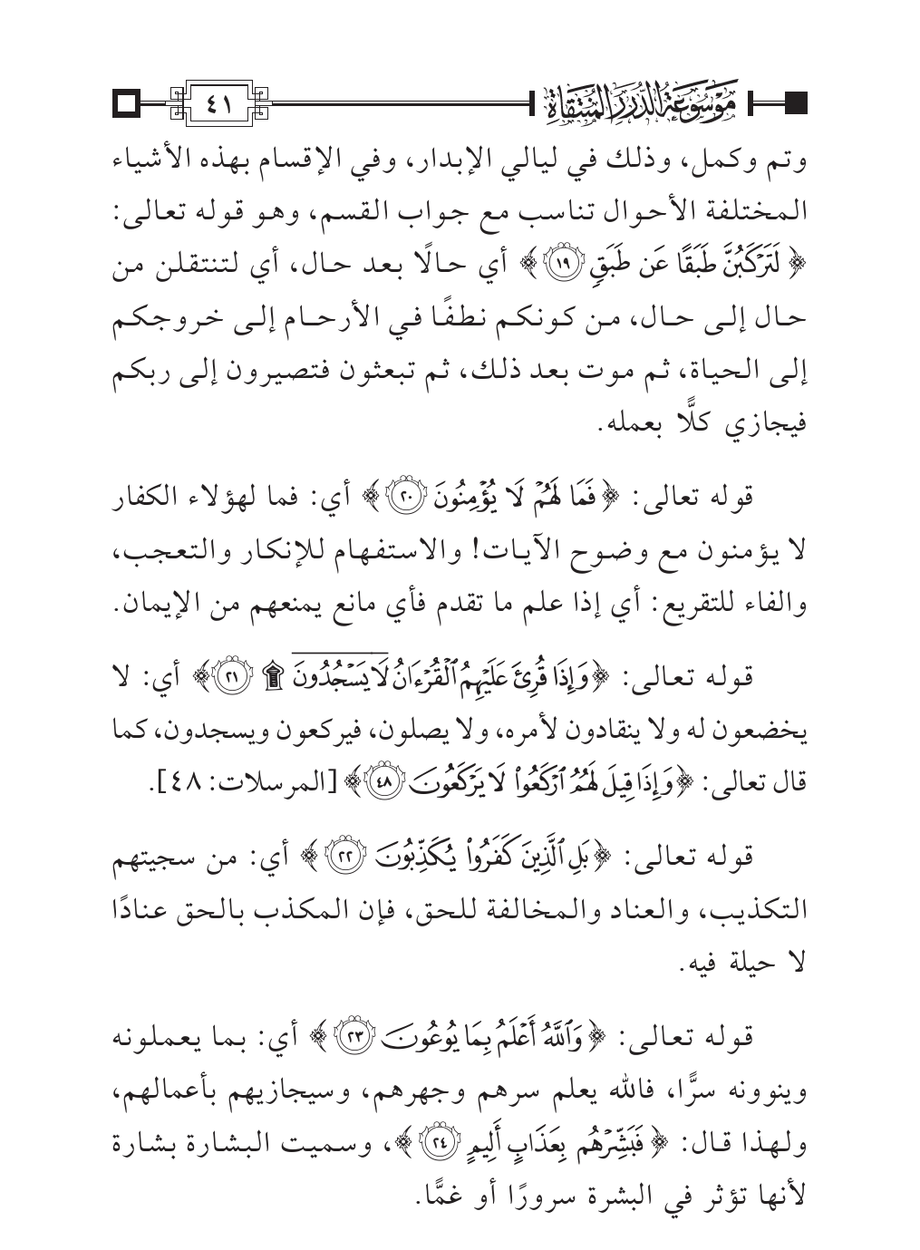 وتم وكمل، وذلك في ليالي الإبدار، وفي الإقسام بهذه الأشياء المختلفة الأحوال تناسب مع جواب القسم، وهو قوله تعالى: {لَتَرْكَبُنَّ طَبَقًا عَنْ طَبَقٍ (١٩)} أي حالًا بعد حال، أي لتنتقلن من حال إلى حال، من كونكم نطفًا في الأرحام إلى خروجكم إلى الحياة، ثم موت بعد ذلك، ثم تبعثون فتصيرون إلى ربكم فيجازي كلًّا بعمله.