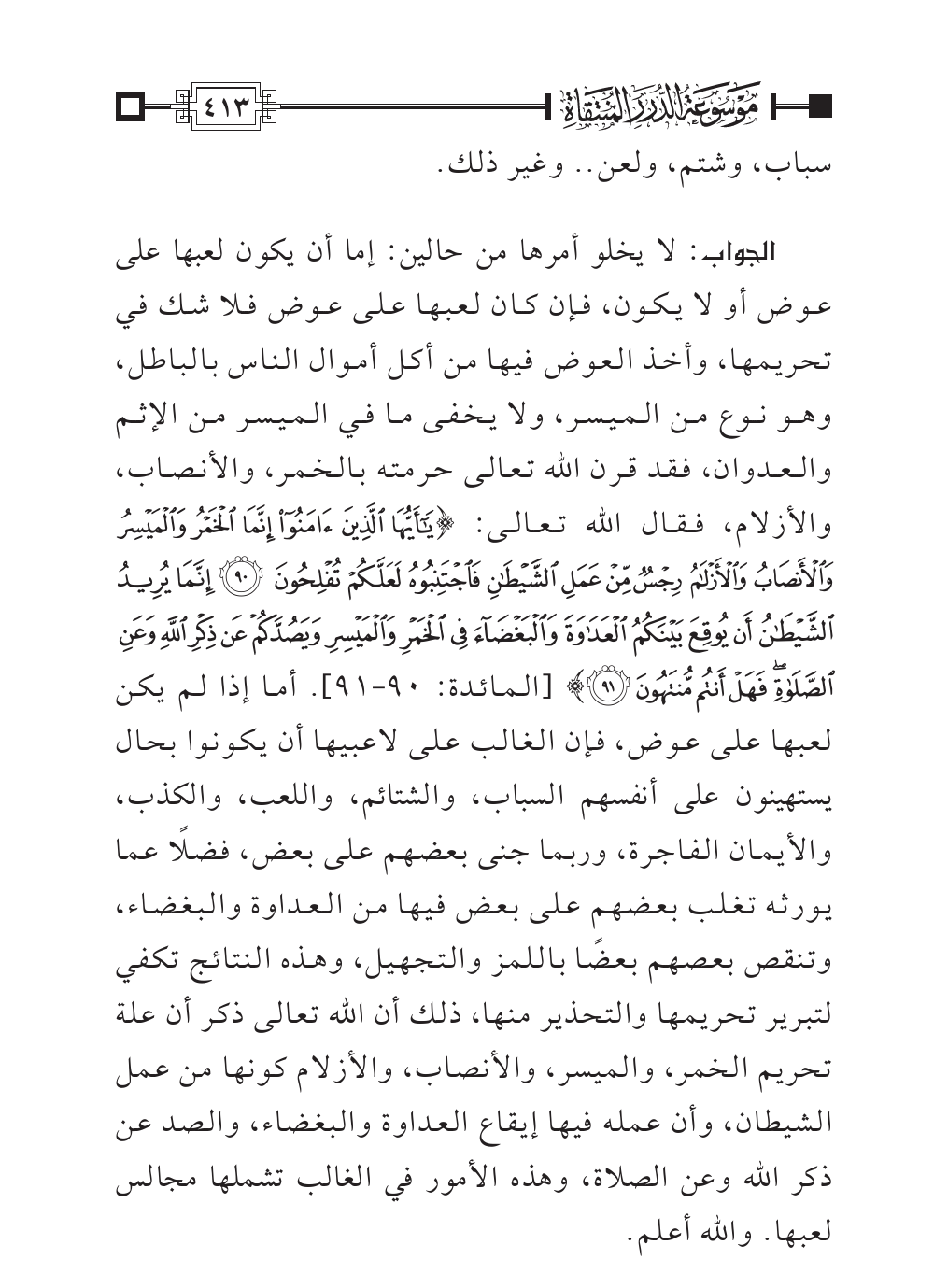 الجواب: لا يخلو أمرها من حالين: إما أن يكون لعبها على عوض أو لا يكون، فإن كان لعبها على عوض فلا شك في تحريمها، وأخذ العوض فيها من أكل أموال الناس بالباطل، وهو نوع من الميسر، ولا يخفى ما في الميسر من الإثم والعدوان، فقد قرن الله تعالى حرمته بالخمر، والأنصاب، والأزلام، فقال الله تعالى: {يَاأَيُّهَا الَّذِينَ آمَنُوا إِنَّمَا الْخَمْرُ وَالْمَيْسِرُ وَالْأَنْصَابُ وَالْأَزْلَامُ رِجْسٌ مِنْ عَمَلِ الشَّيْطَانِ فَاجْتَنِبُوهُ لَعَلَّكُمْ تُفْلِحُونَ (٩٠) إِنَّمَا يُرِيدُ الشَّيْطَانُ أَنْ يُوقِعَ بَيْنَكُمُ الْعَدَاوَةَ وَالْبَغْضَاءَ فِي الْخَمْرِ وَالْمَيْسِرِ وَيَصُدَّكُمْ عَنْ ذِكْرِ اللَّهِ وَعَنِ الصَّلَاةِ فَهَلْ أَنْتُمْ مُنْتَهُونَ (٩١)} [المائدة: ٩٠ - ٩١]. أما إذا لم يكن لعبها على عوض، فإن الغالب على لاعبيها أن يكونوا بحال يستهينون على أنفسهم السباب، والشتائم، واللعب، والكذب، والأيمان الفاجرة، وربما جنى بعضهم على بعض، فضلًا عما يورثه تغلب بعضهم على بعض فيها من العداوة والبغضاء، وتنقص بعصهم بعضًا باللمز والتجهيل، وهذه النتائج تكفي لتبرير تحريمها والتحذير منها، ذلك أن الله تعالى ذكر أن علة تحريم الخمر، والميسر، والأنصاب، والأزلام كونها من عمل الشيطان، وأن عمله فيها إيقاع العداوة والبغضاء، والصد عن ذكر الله وعن الصلاة، وهذه الأمور في الغالب تشملها مجالس لعبها. والله أعلم.
