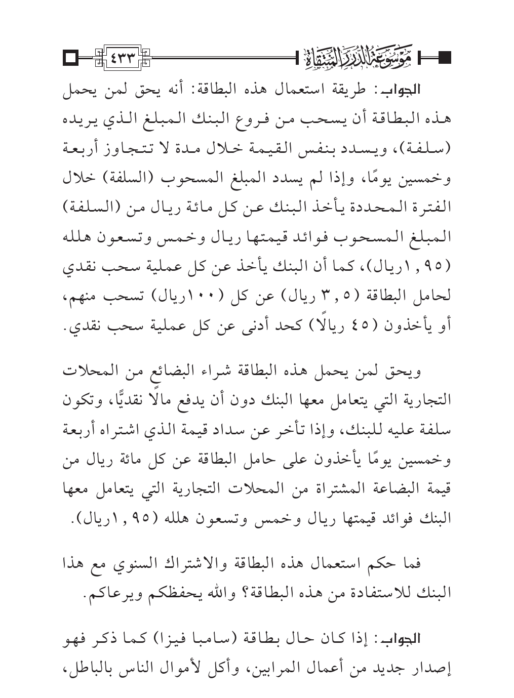 الجواب: طريقة استعمال هذه البطاقة: أنه يحق لمن يحمل هذه البطاقة أن يسحب من فروع البنك المبلغ الذي يريده (سلفة)، ويسدد بنفس القيمة خلال مدة لا تتجاوز أربعة وخمسين يومًا، وإذا لم يسدد المبلغ المسحوب (السلفة) خلال الفترة المحددة يأخذ البنك عن كل مائة ريال من (السلفة) المبلغ المسحوب فوائد قيمتها ريال وخمس وتسعون هلله (١.٩٥ ريال)، كما أن البنك يأخذ عن كل عملية سحب نقدي لحامل البطاقة (٣.٥ ريال) عن كل (١٠٠ ريال) تسحب منهم، أو يأخذون (٤٥ ريالًا) كحد أدنى عن كل عملية سحب نقدي.