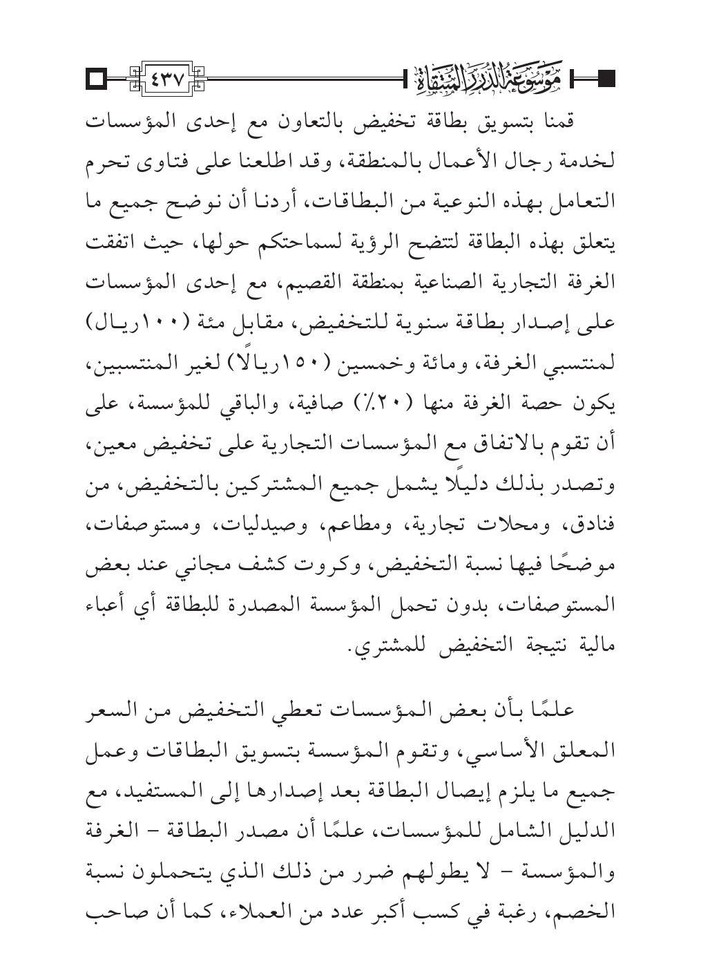 قمنا بتسويق بطاقة تخفيض بالتعاون مع إحدى المؤسسات لخدمة رجال الأعمال بالمنطقة، وقد اطلعنا على فتاوى تحرم التعامل بهذه النوعية من البطاقات، أردنا أن نوضح جميع ما يتعلق بهذه البطاقة لتتضح الرؤية لسماحتكم حولها، حيث اتفقت الغرفة التجارية الصناعية بمنطقة القصيم، مع إحدى المؤسسات على إصدار بطاقة سنوية للتخفيض، مقابل مئة (١٠٠ ريال) لمنتسبي الغرفة، ومائة وخمسين (١٥٠ ريالًا) لغير المنتسبين، يكون حصة الغرفة منها (٢٠%) صافية، والباقي للمؤسسة، على أن تقوم بالاتفاق مع المؤسسات التجارية على تخفيض معين، وتصدر بذلك دليلًا يشمل جميع المشتركين بالتخفيض، من فنادق، ومحلات تجارية، ومطاعم، وصيدليات، ومستوصفات، موضحًا فيها نسبة التخفيض، وكروت كشف مجاني عند بعض المستوصفات، بدون تحمل المؤسسة المصدرة للبطاقة أي أعباء مالية نتيجة التخفيض للمشتري.