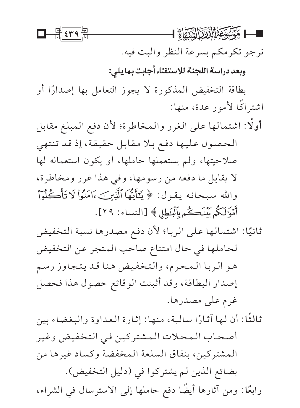 ثانيًا: اشتمالها على الربا؛ لأن دفع مصدرها نسبة التخفيض لحاملها في حال امتناع صاحب المتجر عن التخفيض هو الربا المحرم، والتخفيض هنا قد يتجاوز رسم إصدار البطاقة، وقد أثبتت الوقائع حصول هذا فحصل غرم على مصدرها.
