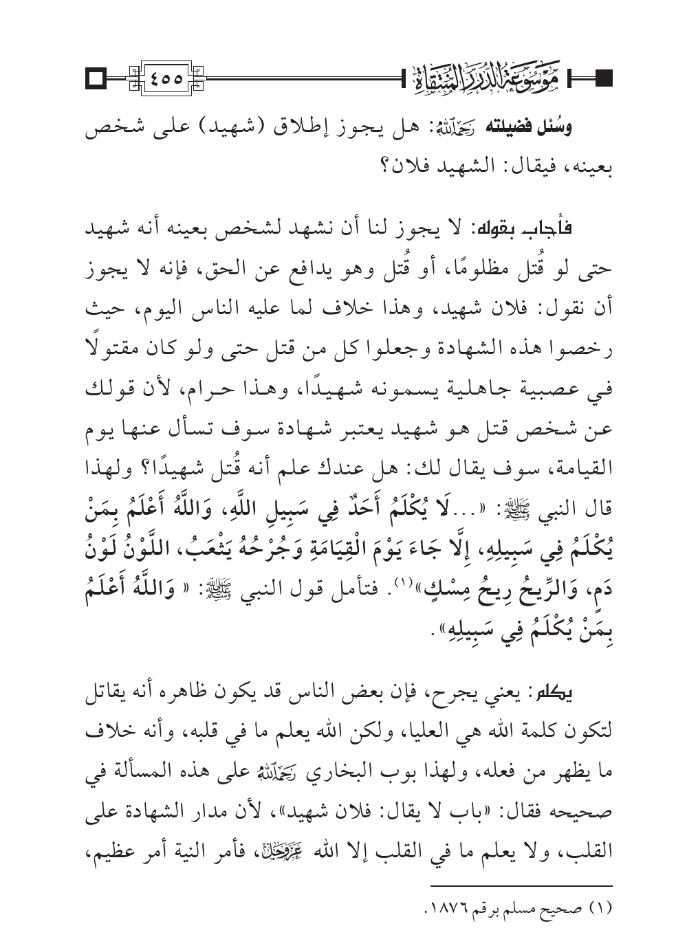 فأجاب بقوله: لا يجوز لنا أن نشهد لشخص بعينه أنه شهيد حتى لو قُتل مظلومًا، أو قُتل وهو يدافع عن الحق، فإنه لا يجوز أن نقول: فلان شهيد، وهذا خلاف لما عليه الناس اليوم، حيث رخصوا هذه الشهادة وجعلوا كل من قتل حتى ولو كان مقتولًا في عصبية جاهلية يسمونه شهيدًا، وهذا حرام، لأن قولك عن شخص قتل هو شهيد يعتبر شهادة سوف تسأل عنها يوم القيامة، سوف يقال لك: هل عندك علم أنه قُتل شهيدًا؟ ولهذا قال النبي - صلى الله عليه وسلم -: « ... لَا يُكْلَمُ أَحَدٌ فِي سَبِيلِ اللَّهِ، وَاللَّهُ أَعْلَمُ بِمَنْ يُكْلَمُ فِي سَبِيلِهِ، إِلَّا جَاءَ يَوْمَ الْقِيَامَةِ وَجُرْحُهُ يَثْعَبُ، اللَّوْنُ لَوْنُ دَمٍ، وَالرِّيحُ رِيحُ مِسْكٍ» (¬١). فتأمل قول النبي - صلى الله عليه وسلم -: «وَاللَّهُ أَعْلَمُ بِمَنْ يُكْلَمُ فِي سَبِيلِهِ».