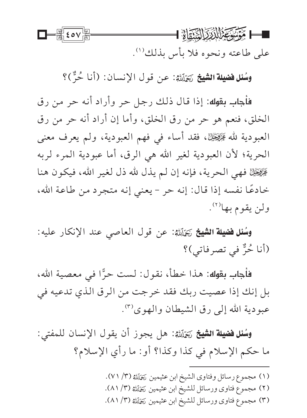 فأجاب بقوله: إذا قال ذلك رجل حر وأراد أنه حر من رق الخلق، فنعم هو حر من رق الخلق، وأما إن أراد أنه حر من رق العبودية لله - عز وجل -، فقد أساء في فهم العبودية، ولم يعرف معنى الحرية؛ لأن العبودية لغير الله هي الرق، أما عبودية المرء لربه - عز وجل - فهي الحرية، فإنه إن لم يذل لله ذل لغير الله، فيكون هنا خادعًا نفسه إذا قال: إنه حر - يعني إنه متجرد من طاعة الله، ولن يقوم بها (¬٢).