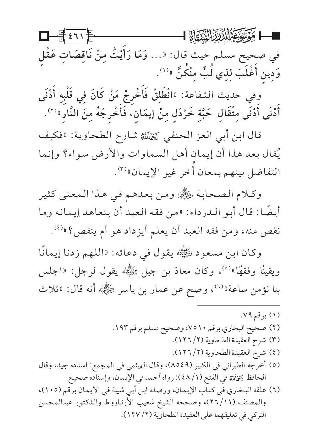 وكلام الصحابة - رضي الله عنهم - ومن بعدهم في هذا المعنى كثير أيضًا: قال أبو الدرداء: «من فقه العبد أن يتعاهد إيمانه وما نقص منه، ومن فقه العبد أن يعلم أيزداد هو أم ينقص؟» (¬٤).