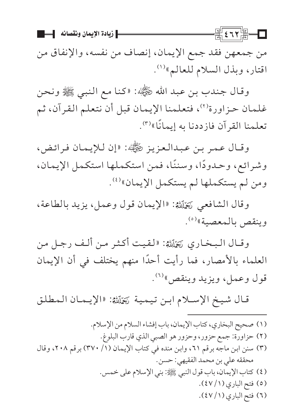 وقال البخاري - رحمه الله -: «لقيت أكثر من ألف رجل من العلماء بالأمصار، فما رأيت أحدًا منهم يختلف في أن الإيمان قول وعمل، ويزيد وينقص» (¬٦).