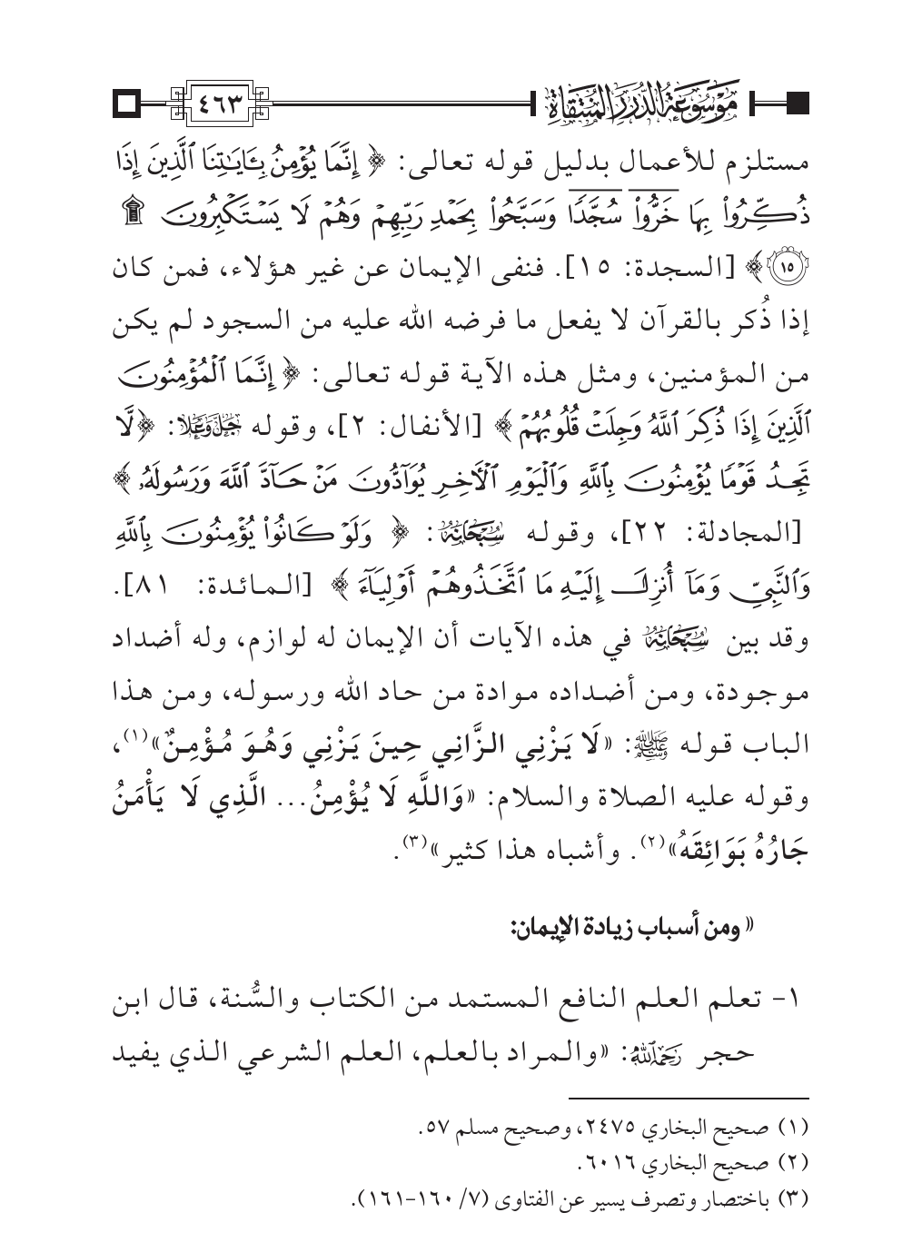 مستلزم للأعمال بدليل قوله تعالى: {إِنَّمَا يُؤْمِنُ بِآيَاتِنَا الَّذِينَ إِذَا ذُكِّرُوا بِهَا خَرُّوا سُجَّدًا وَسَبَّحُوا بِحَمْدِ رَبِّهِمْ وَهُمْ لَا يَسْتَكْبِرُونَ (١٥)} [السجدة: ١٥]. فنفى الإيمان عن غير هؤلاء، فمن كان إذا ذُكر بالقرآن لا يفعل ما فرضه الله عليه من السجود لم يكن من المؤمنين، ومثل هذه الآية قوله تعالى: {إِنَّمَا الْمُؤْمِنُونَ الَّذِينَ إِذَا ذُكِرَ اللَّهُ وَجِلَتْ قُلُوبُهُمْ} [الأنفال: ٢]، وقوله - جل وعلا -: {لَا تَجِدُ قَوْمًا يُؤْمِنُونَ بِاللَّهِ وَالْيَوْمِ الْآخِرِ يُوَادُّونَ مَنْ حَادَّ اللَّهَ وَرَسُولَهُ} [المجادلة: ٢٢]، وقوله -سُبْحَانَهُ-: {وَلَوْ كَانُوا يُؤْمِنُونَ بِاللَّهِ وَالنَّبِيِّ وَمَا أُنْزِلَ إِلَيْهِ مَا اتَّخَذُوهُمْ أَوْلِيَاءَ} [المائدة: ٨١]. وقد بين -سُبْحَانَهُ- في هذه الآيات أن الإيمان له لوازم، وله أضداد موجودة، ومن أضداده موادة من حاد الله ورسوله، ومن هذا الباب قوله - صلى الله عليه وسلم -: «لَا يَزْنِي الزَّانِي حِينَ يَزْنِي وَهُوَ مُؤْمِنٌ» (¬١)، وقوله عليه الصلاة والسلام: «وَاللَّهِ لَا يُؤْمِنُ ... الَّذِي لَا يَأْمَنُ جَارُهُ بَوَائِقَهُ» (¬٢). وأشباه هذا كثير» (¬٣).