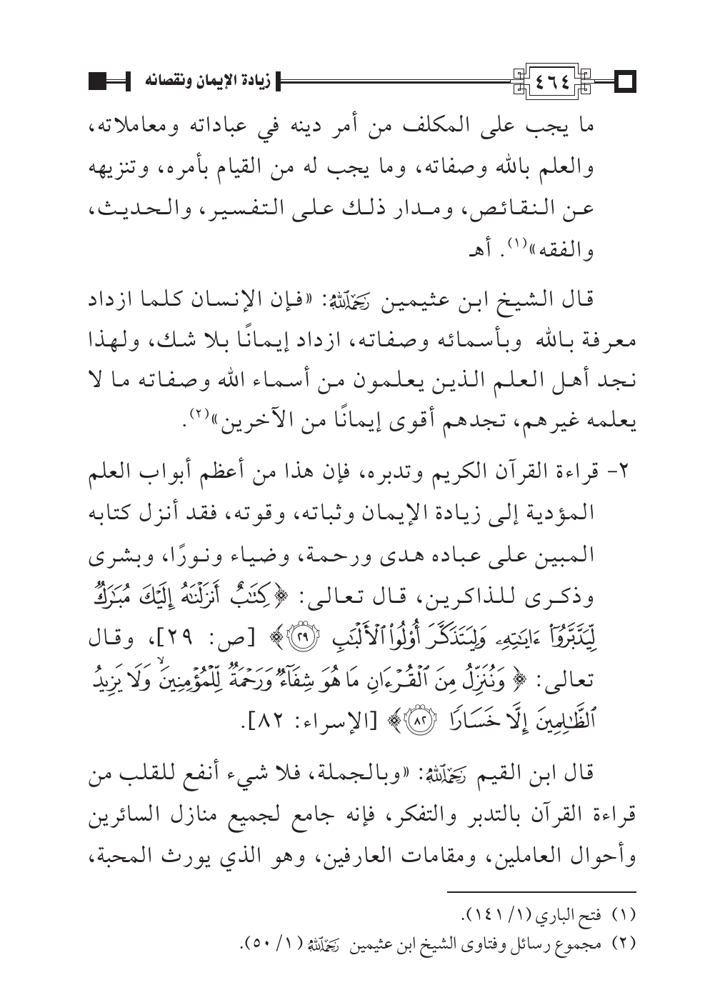 قراءة القرآن الكريم وتدبره، فإن هذا من أعظم أبواب العلم المؤدية إلى زيادة الإيمان وثباته، وقوته، فقد أنزل كتابه المبين على عباده هدى ورحمة، وضياء ونورًا، وبشرى وذكرى للذاكرين، قال تعالى: {كِتَابٌ أَنْزَلْنَاهُ إِلَيْكَ مُبَارَكٌ لِيَدَّبَّرُوا آيَاتِهِ وَلِيَتَذَكَّرَ أُولُو الْأَلْبَابِ (٢٩)} [ص: ٢٩]، وقال تعالى: {وَنُنَزِّلُ مِنَ الْقُرْآنِ مَا هُوَ شِفَاءٌ وَرَحْمَةٌ لِلْمُؤْمِنِينَ وَلَا يَزِيدُ الظَّالِمِينَ إِلَّا خَسَارًا (٨٢)} [الإسراء: ٨٢].