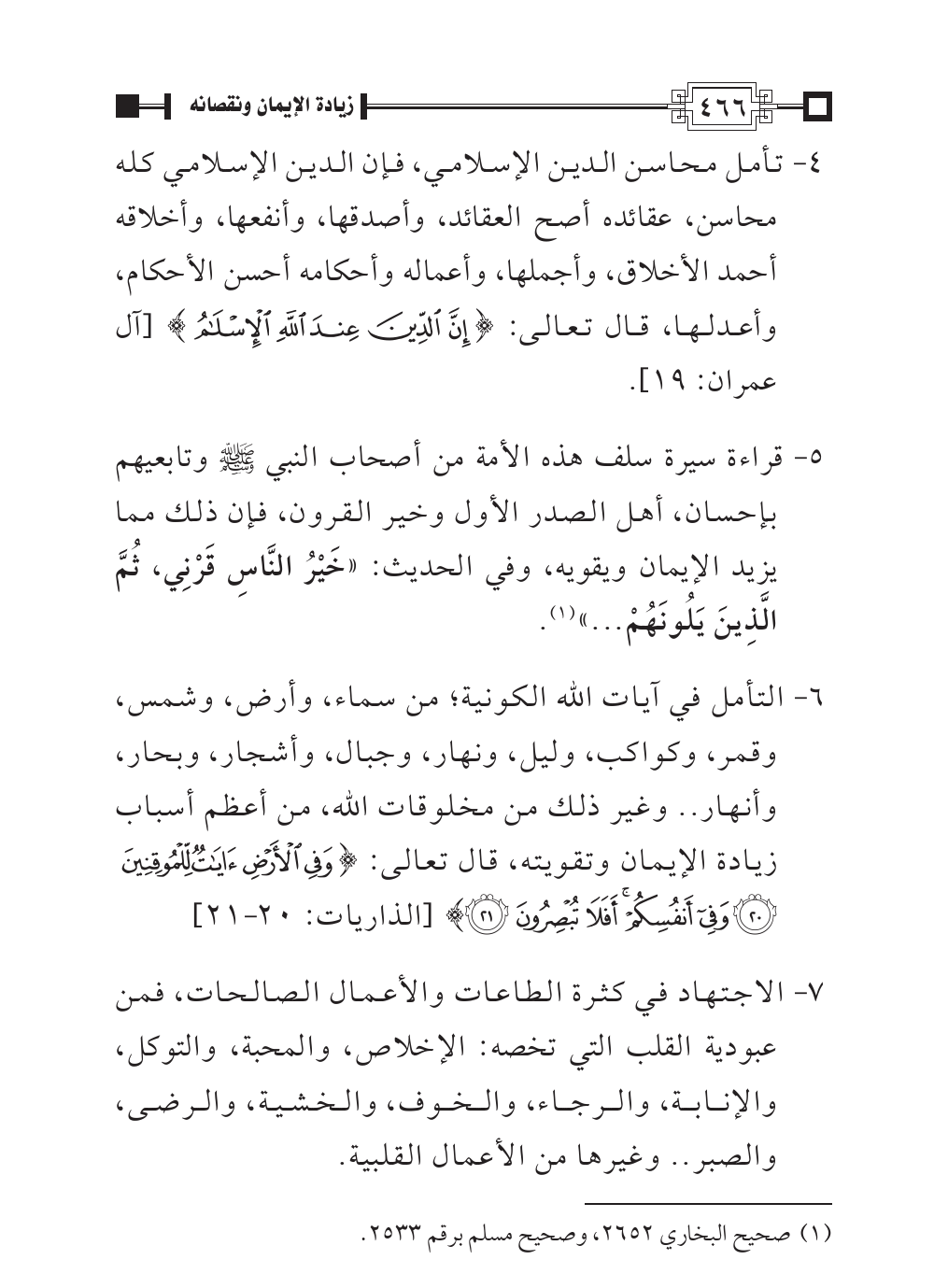 قراءة سيرة سلف هذه الأمة من أصحاب النبي - صلى الله عليه وسلم - وتابعيهم بإحسان، أهل الصدر الأول وخير القرون، فإن ذلك مما يزيد الإيمان ويقويه، وفي الحديث: «خَيْرُ النَّاسِ قَرْنِي، ثُمَّ الَّذِينَ يَلُونَهُمْ ... » (¬١).