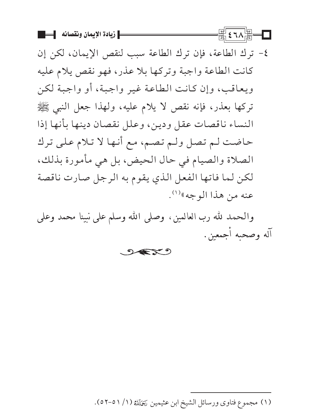 ترك الطاعة، فإن ترك الطاعة سبب لنقص الإيمان، لكن إن كانت الطاعة واجبة وتركها بلا عذر، فهو نقص يلام عليه ويعاقب، وإن كانت الطاعة غير واجبة، أو واجبة لكن تركها بعذر، فإنه نقص لا يلام عليه، ولهذا جعل النبي - صلى الله عليه وسلم - النساء ناقصات عقل ودين، وعلل نقصان دينها بأنها إذا حاضت لم تصل ولم تصم، مع أنها لا تلام على ترك الصلاة والصيام في حال الحيض، بل هي مأمورة بذلك، لكن لما فاتها الفعل الذي يقوم به الرجل صارت ناقصة عنه من هذا الوجه» (¬١).