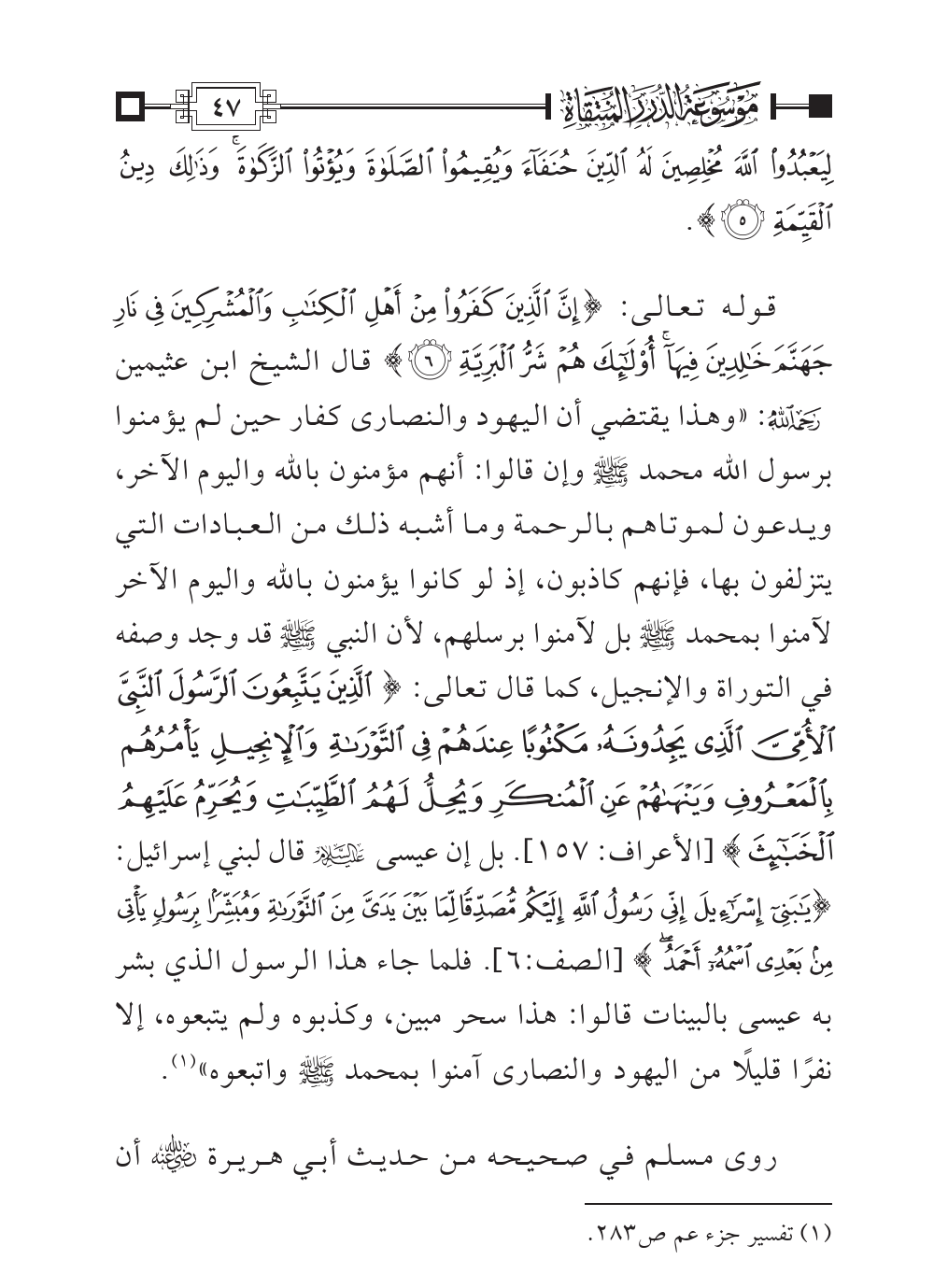 قوله تعالى: {إِنَّ الَّذِينَ كَفَرُوا مِنْ أَهْلِ الْكِتَابِ وَالْمُشْرِكِينَ فِي نَارِ جَهَنَّمَ خَالِدِينَ فِيهَا أُولَئِكَ هُمْ شَرُّ الْبَرِيَّةِ (٦)} قال الشيخ ابن عثيمين - رحمه الله -: «وهذا يقتضي أن اليهود والنصارى كفار حين لم يؤمنوا برسول الله محمد - صلى الله عليه وسلم - وإن قالوا: أنهم مؤمنون بالله واليوم الآخر، ويدعون لموتاهم بالرحمة وما أشبه ذلك من العبادات التي يتزلفون بها، فإنهم كاذبون، إذ لو كانوا يؤمنون بالله واليوم الآخر لآمنوا بمحمد - صلى الله عليه وسلم - بل لآمنوا برسلهم، لأن النبي - صلى الله عليه وسلم - قد وجد وصفه في التوراة والإنجيل، كما قال تعالى: {الَّذِينَ يَتَّبِعُونَ الرَّسُولَ النَّبِيَّ الْأُمِّيَّ الَّذِي يَجِدُونَهُ مَكْتُوبًا عِنْدَهُمْ فِي التَّوْرَاةِ وَالْإِنْجِيلِ يَأْمُرُهُمْ بِالْمَعْرُوفِ وَيَنْهَاهُمْ عَنِ الْمُنْكَرِ وَيُحِلُّ لَهُمُ الطَّيِّبَاتِ وَيُحَرِّمُ عَلَيْهِمُ الْخَبَائِثَ} [الأعراف: ١٥٧]. بل إن عيسى - عليه السلام -قال لبني إسرائيل: {يَابَنِي إِسْرَائِيلَ إِنِّي رَسُولُ اللَّهِ إِلَيْكُمْ مُصَدِّقًا لِمَا بَيْنَ يَدَيَّ مِنَ التَّوْرَاةِ وَمُبَشِّرًا بِرَسُولٍ يَأْتِي مِنْ بَعْدِي اسْمُهُ أَحْمَدُ} [الصف:٦]. فلما جاء هذا الرسول الذي بشر به عيسى بالبينات قالوا: هذا سحر مبين، وكذبوه ولم يتبعوه، إلا نفرًا قليلًا من اليهود والنصارى آمنوا بمحمد - صلى الله عليه وسلم - واتبعوه» (¬١).