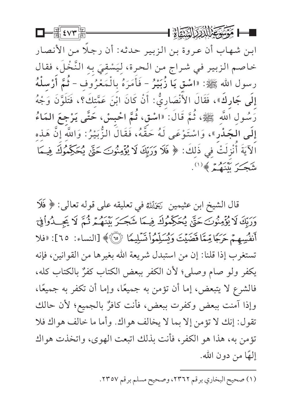 ابن شهاب أن عروة بن الزبير حدثه: أن رجلًا من الأنصار خاصم الزبير في شراج من الحرة، لِيَسْقِيَ بِهِ النَّخْلَ، فقال رسول الله - صلى الله عليه وسلم -: «اسْقِ يَا زُبَيْرُ - فَأَمَرَهُ بِالْمَعْرُوفِ - ثُمَّ أَرْسِلْهُ إِلَى جَارِكَ»، فَقَالَ الأَنْصَارِيُّ: أَنْ كَانَ ابْنَ عَمَّتِكَ؟، فَتَلَوَّنَ وَجْهُ رَسُولِ اللَّهِ - صلى الله عليه وسلم -، ثُمَّ قَالَ: «اسْقِ، ثُمَّ احْبِسْ، حَتَّى يَرْجِعَ المَاءُ إِلَى الجَدْرِ»، وَاسْتَوْعَى لَهُ حَقَّهُ، فَقَالَ الزُّبَيْرُ: وَاللَّهِ إِنَّ هَذِهِ الآيَةَ أُنْزِلَتْ فِي ذَلِكَ: {فَلَا وَرَبِّكَ لَا يُؤْمِنُونَ حَتَّى يُحَكِّمُوكَ فِيمَا شَجَرَ بَيْنَهُمْ} (¬١).