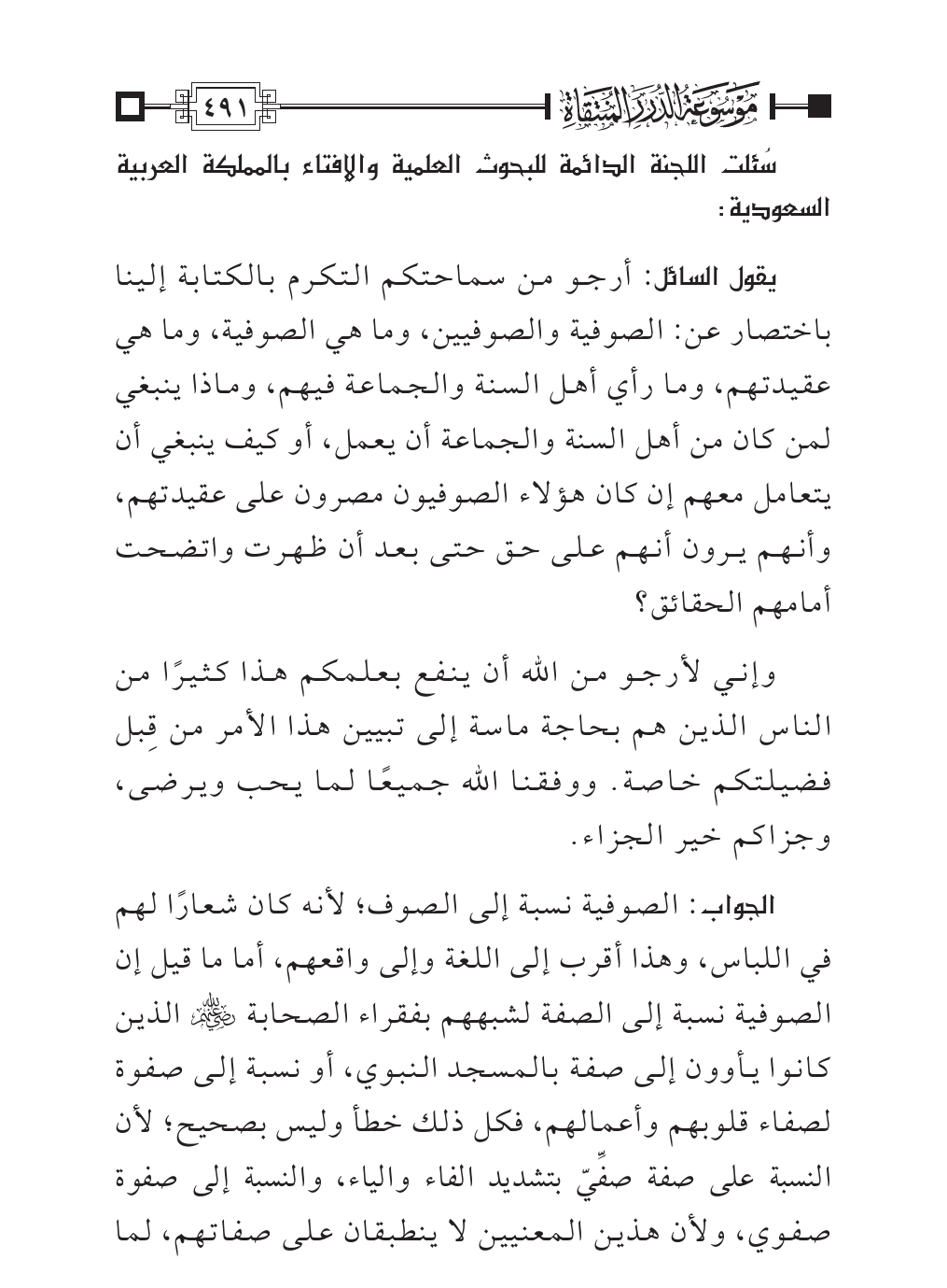 الجواب: الصوفية نسبة إلى الصوف؛ لأنه كان شعارًا لهم في اللباس، وهذا أقرب إلى اللغة وإلى واقعهم، أما ما قيل إن الصوفية نسبة إلى الصفة لشبههم بفقراء الصحابة - رضي الله عنهم - الذين كانوا يأوون إلى صفة بالمسجد النبوي، أو نسبة إلى صفوة لصفاء قلوبهم وأعمالهم، فكل ذلك خطأ وليس بصحيح؛ لأن النسبة على صفة صفِّيّ بتشديد الفاء والياء، والنسبة إلى صفوة صفوي، ولأن هذين المعنيين لا ينطبقان على صفاتهم، لما