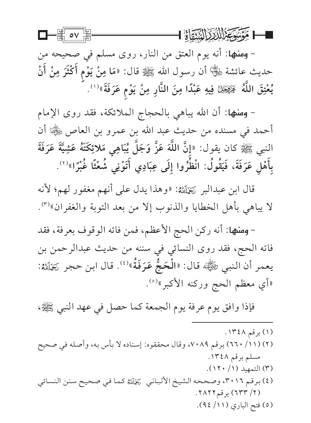 - ومنها: أنه يوم العتق من النار، روى مسلم في صحيحه من حديث عائشة - رضي الله عنها - أن رسول الله - صلى الله عليه وسلم - قال: «مَا مِنْ يَوْمٍ أَكْثَرَ مِنْ أَنْ يُعْتِقَ اللَّهُ - عز وجل - فِيهِ عَبْدًا مِنَ النَّارِ مِنْ يَوْمِ عَرَفَةَ» (¬١).