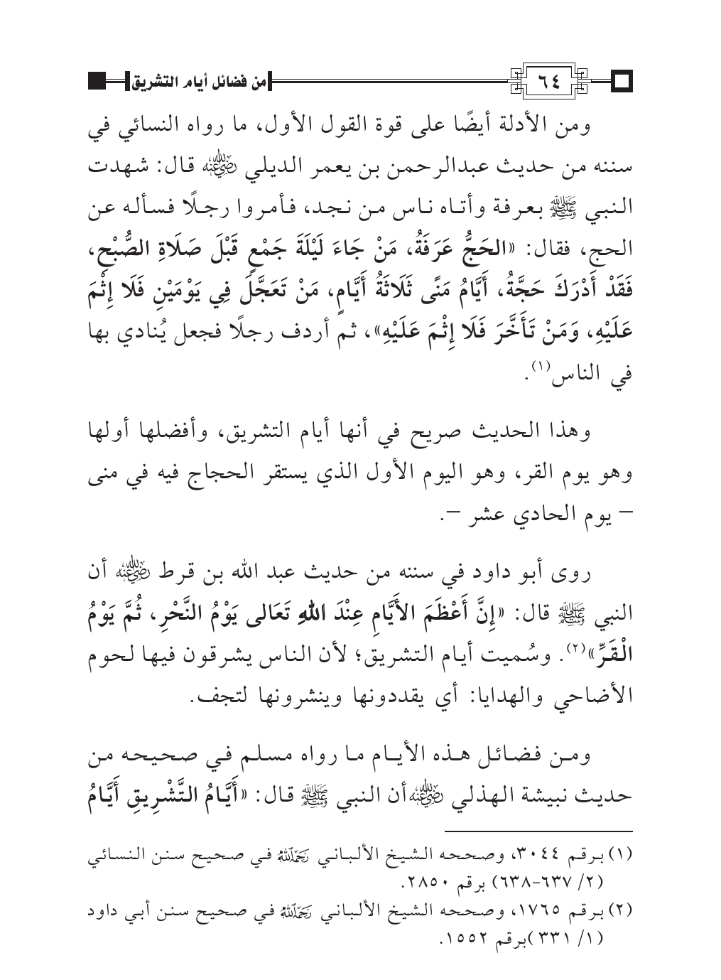 ومن الأدلة أيضًا على قوة القول الأول، ما رواه النسائي في سننه من حديث عبدالرحمن بن يعمر الديلي - رضي الله عنه - قال: شهدت النبي - صلى الله عليه وسلم - بعرفة وأتاه ناس من نجد، فأمروا رجلًا فسأله عن الحج، فقال: «الحَجُّ عَرَفَةُ، مَنْ جَاءَ لَيْلَةَ جَمْعٍ قَبْلَ صَلَاةِ الصُّبْحِ، فَقَدْ أَدْرَكَ حَجَّةُ، أَيَّامُ مَنًى ثَلَاثَةُ أَيَّامٍ، مَنْ تَعَجَّلَ فِي يَوْمَيْنِ فَلَا إِثْمَ عَلَيْهِ، وَمَنْ تَأَخَّرَ فَلَا إِثْمَ عَلَيْهِ»، ثم أردف رجلًا فجعل يُنادي بها في الناس (¬١).