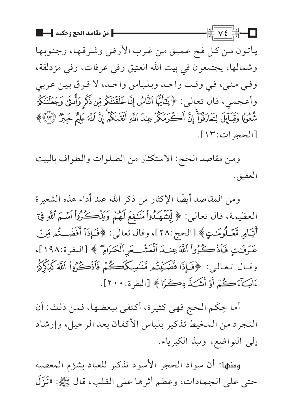 ومن المقاصد أيضًا الإكثار من ذكر الله عند أداء هذه الشعيرة العظيمة، قال تعالى: {لِيَشْهَدُوا مَنَافِعَ لَهُمْ وَيَذْكُرُوا اسْمَ اللَّهِ فِي أَيَّامٍ مَعْلُومَاتٍ} [الحج:٢٨]، وقال تعالى: {فَإِذَا أَفَضْتُمْ مِنْ عَرَفَاتٍ فَاذْكُرُوا اللَّهَ عِنْدَ الْمَشْعَرِ الْحَرَامِ} [البقرة:١٩٨]، وقال تعالى: {فَإِذَا قَضَيْتُمْ مَنَاسِكَكُمْ فَاذْكُرُوا اللَّهَ كَذِكْرِكُمْ آبَاءَكُمْ أَوْ أَشَدَّ ذِكْرًا} [البقرة:٢٠٠].