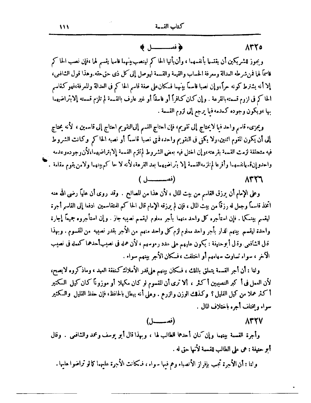 (٨٣١٧) فَصْلٌ: وَعَلَى الْإِمَامِ أَنْ يَرْزُقَ الْقَاسِمَ مِنْ بَيْتِ الْمَالِ؛ لِأَنَّ هَذَا مِنْ الْمَصَالِحِ، وَقَدْ رُوِيَ أَنَّ عَلِيًّا - رَضِيَ اللَّهُ عَنْهُ - اتَّخَذَ قَاسِمًا، وَجَعَلَ لَهُ رِزْقًا مِنْ بَيْتِ الْمَالِ. فَإِنْ لَمْ يَرْزُقْهُ الْإِمَامُ، قَالَ الْحَاكِمُ لِلْمُتَقَاسَمَيْنِ: ادْفَعَا إلَى الْقَاسِمِ أُجْرَةً لِيَقْسِمَ بَيْنَكُمَا. فَإِنْ اسْتَأْجَرَهُ كُلُّ وَاحِدٍ مِنْهُمَا بِأَجْرٍ مَعْلُومٍ لِيَقْسِمَ نَصِيبَهُ، جَازَ، وَإِنْ اسْتَأْجَرُوهُ جَمِيعًا إجَارَةً وَاحِدَةً لِيَقْسِمَ بَيْنَهُمْ الدَّارَ بِأَجْرِ وَاحِدٍ مَعْلُومٍ، لَزِمَ كُلَّ وَاحِدٍ مِنْهُمْ مِنْ الْأَجْرِ بِقَدْرِ نَصِيبِهِ مِنْ الْمَقْسُومِ. وَبِهَذَا قَالَ الشَّافِعِيُّ.