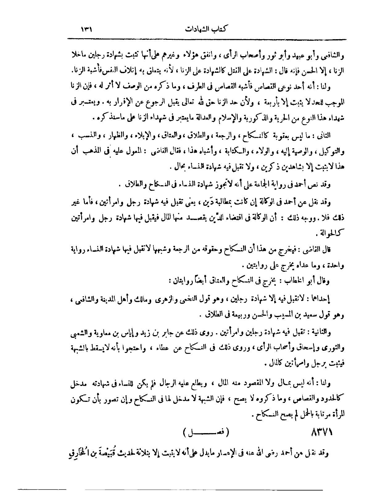 الثَّانِي، مَا لَيْسَ بِعُقُوبَةٍ كَالنِّكَاحِ، وَالرَّجْعَةِ، وَالطَّلَاقِ، وَالْعَتَاقِ، وَالْإِيلَاءِ، وَالظِّهَارِ، وَالنَّسَبِ، وَالتَّوْكِيلِ، وَالْوَصِيَّةِ إلَيْهِ، وَالْوَلَاءِ، وَالْكِتَابَةِ، وَأَشْبَاهِ هَذَا. فَقَالَ الْقَاضِي: الْمُعَوَّلُ عَلَيْهِ فِي الْمَذْهَبِ، أَنَّ هَذَا لَا يَثْبُتُ إلَّا بِشَاهِدَيْنِ ذَكَرَيْنِ، وَلَا تُقْبَلُ فِيهِ شَهَادَةُ النِّسَاءِ بِحَالٍ. وَقَدْ نَصَّ أَحْمَدُ فِي رِوَايَةِ الْجَمَاعَةِ، عَلَى أَنَّهُ لَا تَجُوزُ شَهَادَةُ النِّسَاءِ فِي النِّكَاحِ وَالطَّلَاقِ. وَقَدْ نُقِلَ عَنْ أَحْمَدَ، فِي الْوَكَالَةِ: إنْ كَانَتْ بِمُطَالَبَةِ دَيْنٍ - يَعْنِي تُقْبَلُ فِيهِ شَهَادَةُ رَجُلٍ وَامْرَأَتَيْنِ - فَأَمَّا غَيْرُ ذَلِكَ فَلَا.