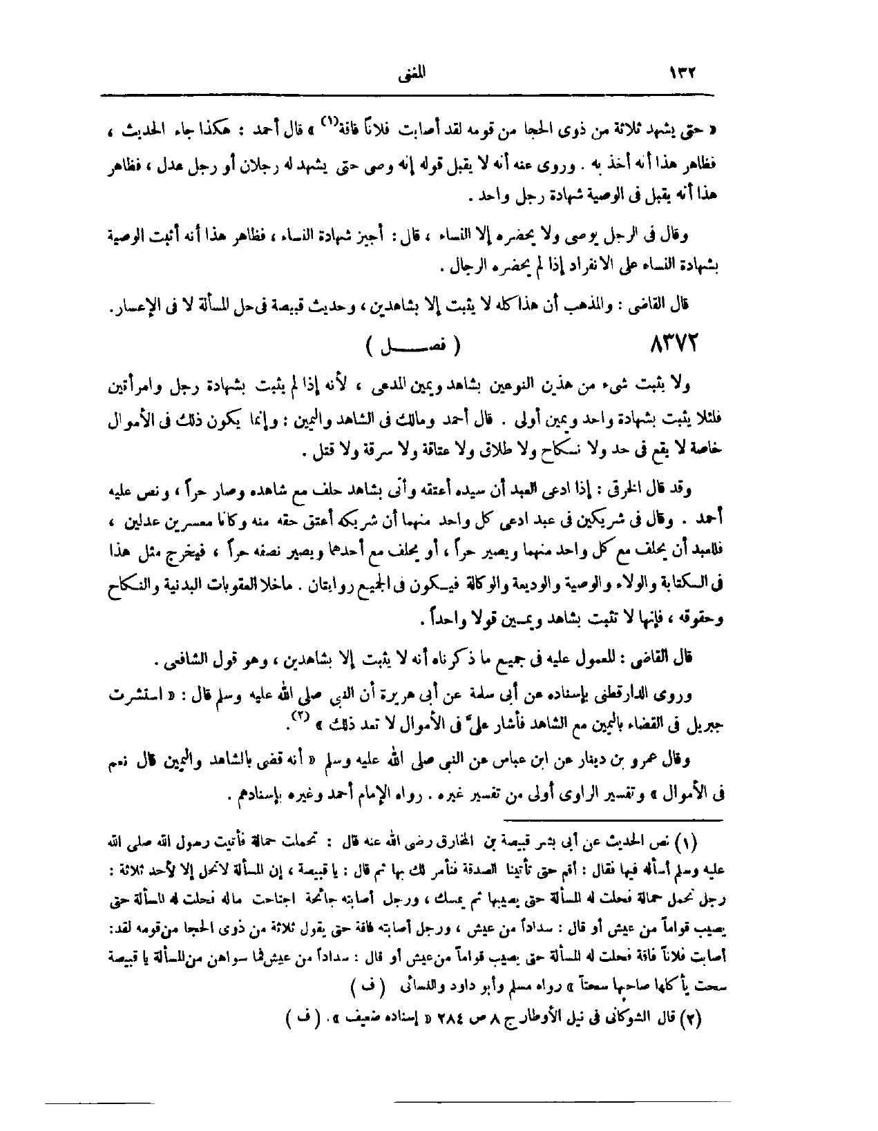 قَالَ أَحْمَدُ: هَكَذَا جَاءَ الْحَدِيثُ. فَظَاهِرُ هَذَا أَنَّهُ أَخَذَ بِهِ. وَرُوِيَ عَنْهُ، أَنَّهُ لَا يُقْبَلُ قَوْلُهُ إنَّهُ وَصَّى، حَتَّى يَشْهَدَ لَهُ رَجُلَانِ، أَوْ رَجُلٌ عَدْلٌ. فَظَاهِرُ هَذَا أَنَّهُ يُقْبَلُ فِي الْوَصِيَّةِ شَهَادَةُ رَجُلٍ وَاحِدٍ. وَقَالَ فِي الرَّجُلِ: يُوَصِّي وَلَا يَحْضُرُهُ إلَّا النِّسَاءُ. قَالَ: أُجِيزُ شَهَادَةَ النِّسَاءِ. فَظَاهِرُ هَذَا أَنَّهُ أَثْبَتَ الْوَصِيَّةَ بِشَهَادَةِ النِّسَاءِ عَلَى الِانْفِرَادِ، إذَا لَمْ يَحْضُرْهُ الرِّجَالُ. قَالَ الْقَاضِي: وَالْمَذْهَبُ أَنَّ هَذَا كُلَّهُ لَا يَثْبُتُ إلَّا بِشَاهِدَيْنِ، وَحَدِيثُ قَبِيصَةَ فِي حِلِّ الْمَسْأَلَةِ، لَا فِي الْإِعْسَارِ. (٨٣٣٥) فَصْلٌ: وَلَا يَثْبُتُ شَيْءٌ مِنْ هَذَيْنِ النَّوْعَيْنِ بِشَاهِدٍ وَيَمِينِ الْمُدَّعِي؛ لِأَنَّهُ إذَا لَمْ يَثْبُتْ بِشَهَادَةِ رَجُلٍ وَامْرَأَتَيْنِ، فَلِئَلَّا يَثْبُتَ بِشَهَادَةِ وَاحِدٍ وَيَمِينٍ أَوْلَى. قَالَ أَحْمَدُ، وَمَالِكٌ، فِي الشَّاهِدِ وَالْيَمِينِ: إنَّمَا يَكُونُ ذَلِكَ فِي الْأَمْوَالِ خَاصَّةً، لَا يَقَعُ فِي حَدٍّ، وَلَا نِكَاحٍ، وَلَا طَلَاقٍ، وَلَا عَتَاقَةٍ، وَلَا سَرِقَةٍ، وَلَا قَتْلٍ.