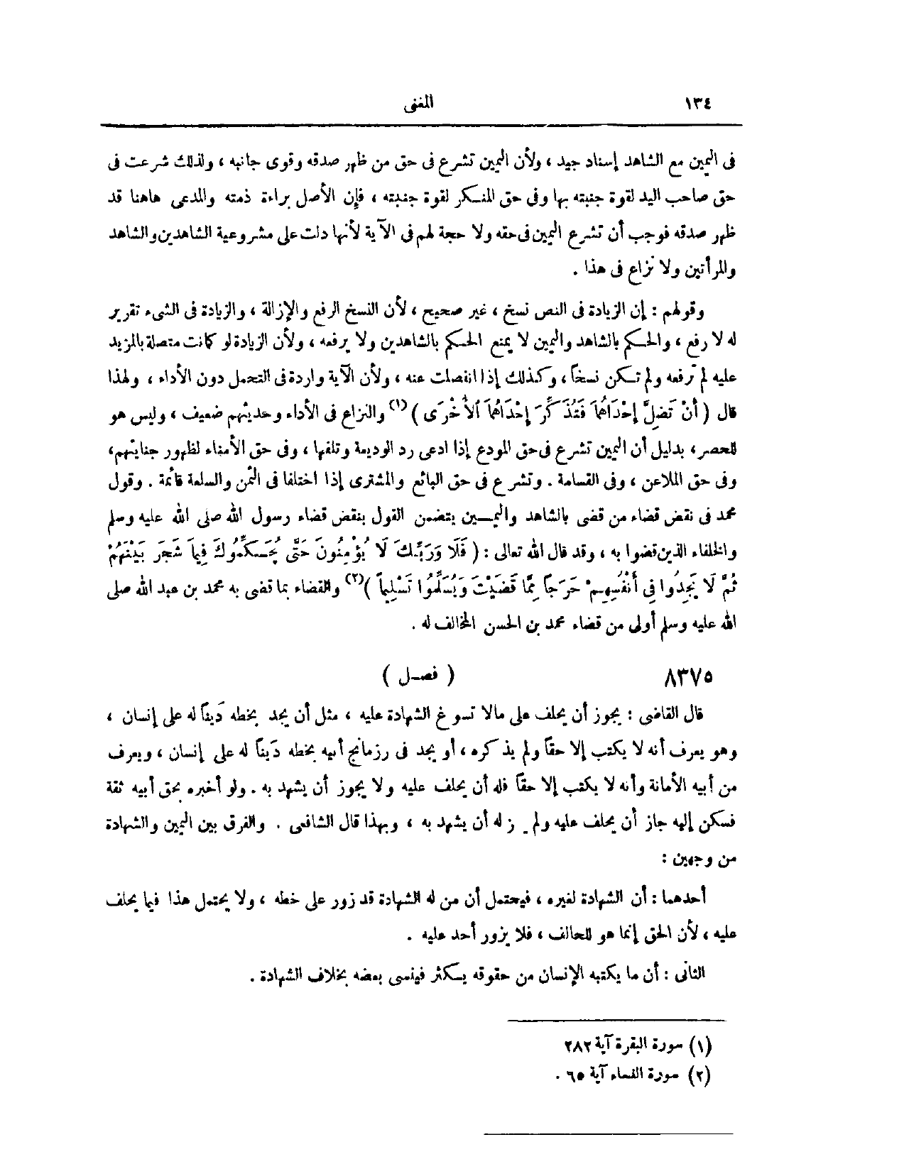 وَلِأَنَّ الْيَمِينَ تُشْرَعُ فِي حَقِّ مَنْ ظَهَرَ صِدْقُهُ، وَقَوِيَ جَانِبُهُ، وَلِذَلِكَ شُرِعَتْ فِي حَقِّ صَاحِبِ الْيَدِ لِقُوَّةِ جَنْبِهِ بِهَا، وَفِي حَقِّ الْمُنْكِرِ لِقُوَّةِ جَنْبِهِ، فَإِنَّ الْأَصْلَ بَرَاءَةُ ذِمَّتِهِ، وَالْمُدَّعِي هَاهُنَا قَدْ ظَهَرَ صِدْقُهُ، فَوَجَبَ أَنْ تُشْرَعَ الْيَمِينُ فِي حَقِّهِ. وَلَا حَجَّةَ لَهُمْ فِي الْآيَةِ؛ لِأَنَّهَا دَلَّتْ عَلَى مَشْرُوعِيَّةِ الشَّاهِدَيْنِ، وَالشَّاهِدِ وَالْمَرْأَتَيْنِ، وَلَا نِزَاعَ فِي هَذَا. وَقَوْلُهُمْ: إنَّ الزِّيَادَةَ فِي النَّصِّ نَسْخٌ.