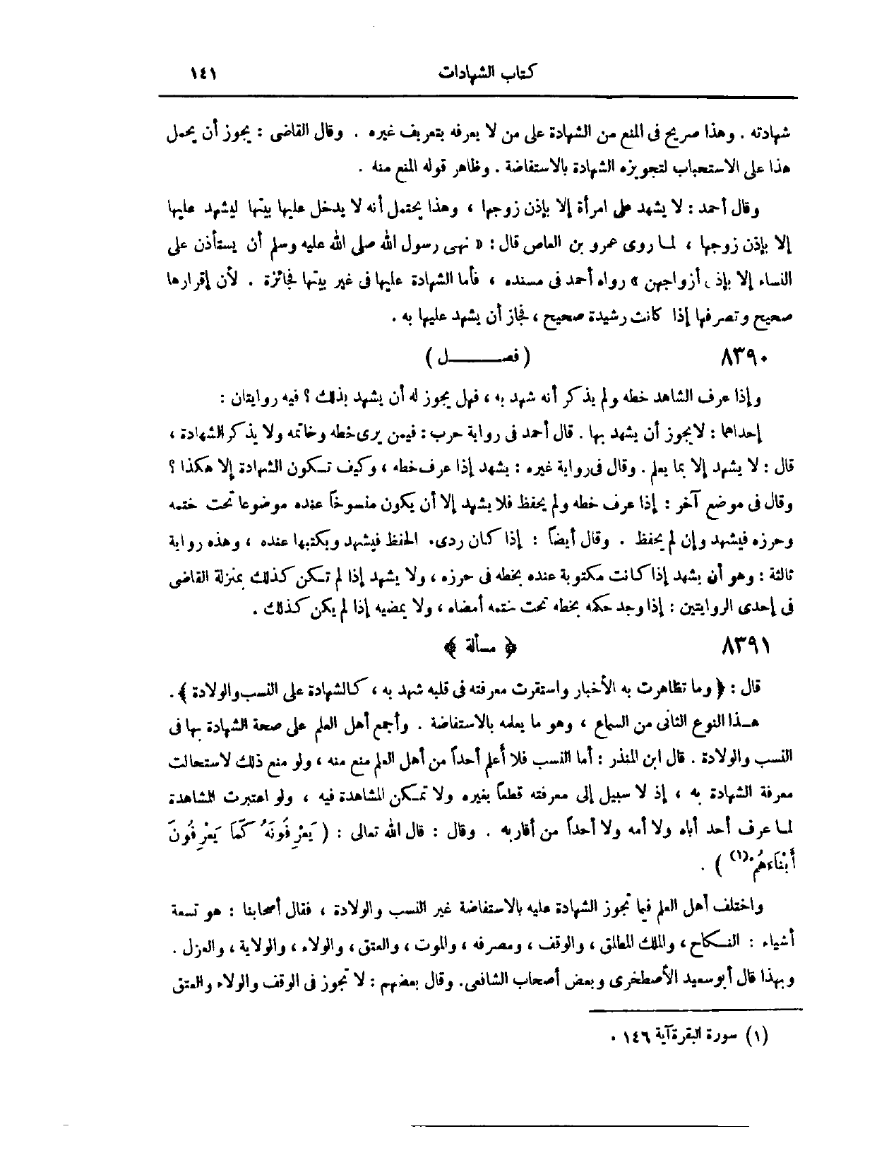 (٨٣٥٤) مَسْأَلَةٌ؛ قَالَ: (وَمَا تَظَاهَرَتْ بِهِ الْأَخْبَارُ، وَاسْتَقَرَّتْ مَعْرِفَتُهُ فِي قَلْبِهِ، شَهِدَ بِهِ، كَالشَّهَادَةِ عَلَى النَّسَبِ وَالْوِلَادَةِ) هَذَا النَّوْعُ الثَّانِي مِنْ السَّمَاعِ، وَهُوَ مَا يَعْلَمُهُ بِالِاسْتِفَاضَةِ. وَأَجْمَعَ أَهْلُ الْعِلْمِ عَلَى صِحَّةِ الشَّهَادَةِ بِهَا فِي النَّسَبِ وَالْوِلَادَةِ. قَالَ ابْنُ الْمُنْذِرِ: أَمَّا النَّسَبُ فَلَا أَعْلَمُ أَحَدًا مِنْ أَهْلِ الْعِلْمِ مَنَعَ مِنْهُ، وَلَوْ مُنِعَ ذَلِكَ لَاسْتَحَالَتْ مَعْرِفَةُ الشَّهَادَةُ بِهِ، إذْ لَا سَبِيلَ إلَى مَعْرِفَتِهِ قَطْعًا بِغَيْرِهِ، وَلَا تُمْكِنُ الْمُشَاهَدَةُ فِيهِ، وَلَوْ اُعْتُبِرْت الْمُشَاهَدَةُ، لَمَا عَرَفَ أَحَدٌ أَبَاهُ، وَلَا أُمَّهُ، وَلَا أَحَدًا مِنْ أَقَارِبِهِ. وَقَالَ: قَالَ اللَّهُ تَعَالَى: {يَعْرِفُونَهُ كَمَا يَعْرِفُونَ أَبْنَاءَهُمْ} [البقرة: ١٤٦] .