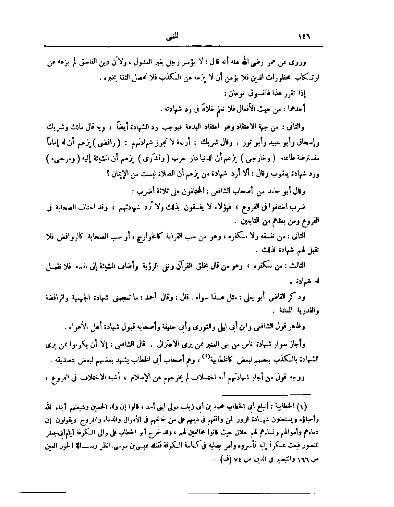 قَالَ: وَقَالَ أَحْمَدُ: مَا تُعْجِبُنِي شَهَادَةُ الْجَهْمِيَّةِ، وَالرَّافِضَةِ، وَالْقَدَرِيَّةِ الْمُعْلِنَةِ. وَظَاهِرُ قَوْلِ الشَّافِعِيِّ، وَابْنِ أَبِي لَيْلَى، وَالثَّوْرِيِّ، وَأَبِي حَنِيفَةَ وَأَصْحَابِهِ، قَبُولُ شَهَادَةِ أَهْلِ الْأَهْوَاءِ. وَأَجَازَ سَوَّارٌ شَهَادَةَ نَاسٍ مِنْ بَنِي الْعَنْبَرِ، مِمَّنْ يَرَى الِاعْتِزَالَ. قَالَ الشَّافِعِيُّ: إلَّا أَنْ يَكُونُوا مِمَّنْ يَرَى الشَّهَادَةَ بِالْكَذِبِ بَعْضُهُمْ لِبَعْضٍ، كَالْخَطَّابِيَّةِ، وَهُمْ أَصْحَابُ أَبِي الْخَطَّابِ. يَشْهَدُ بَعْضُهُمْ لِبَعْضٍ بِتَصْدِيقِهِ. وَوَجْهُ قَوْلِ مَنْ أَجَازَ شَهَادَتَهُمْ، أَنَّهُ اخْتِلَافٌ لَمْ يُخْرِجْهُمْ عَنْ الْإِسْلَامِ، أَشْبَهَ الِاخْتِلَافَ فِي الْفُرُوعِ،