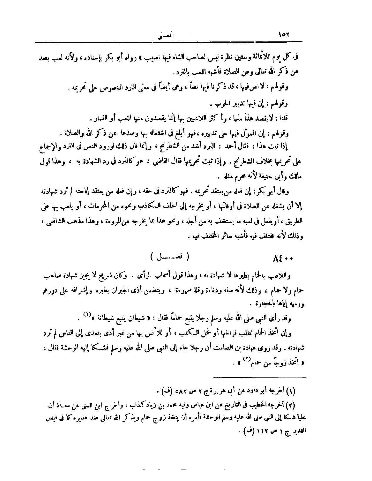 (٨٣٦٣) فَصْلٌ: وَاللَّاعِبُ بِالْحَمَامِ يُطِيرُهَا، لَا شَهَادَةَ لَهُ. وَهَذَا قَوْلُ أَصْحَابِ الرَّأْيِ. وَكَانَ شُرَيْحٌ لَا يُجِيزُ شَهَادَةَ صَاحِبِ حَمَامٍ وَلَا حَمَّامٍ؛ وَذَلِكَ لِأَنَّهُ سَفَهٌ وَدَنَاءَةٌ وَقِلَّةُ مُرُوءَةٍ، وَيَتَضَمَّنُ أَذَى الْجِيرَانِ بِطَيْرِهِ، وَإِشْرَافِهِ عَلَى دُورِهِمْ، وَرَمْيِهِ إيَّاهَا بِالْحِجَارَةِ. وَقَدْ «رَأَى النَّبِيُّ - صَلَّى اللَّهُ عَلَيْهِ وَسَلَّمَ - رَجُلًا يَتْبَعُ حَمَامًا، فَقَالَ: شَيْطَانٌ يَتْبَعُ شَيْطَانَةً» . وَإِنْ اتَّخَذَ الْحَمَامَ لِطَلَبِ فِرَاخِهَا، أَوْ لِحَمْلِ الْكُتُبِ، أَوْ لِلْأُنْسِ بِهَا مِنْ غَيْرِ أَذًى يَتَعَدَّى إلَى النَّاسِ، لَمْ تُرَدَّ شَهَادَتُهُ. وَقَدْ رَوَى عُبَادَةَ بْنُ الصَّامِتِ، «أَنَّ رَجُلًا جَاءَ إلَى النَّبِيِّ - صَلَّى اللَّهُ عَلَيْهِ وَسَلَّمَ - فَشَكَا إلَيْهِ الْوَحْشَةَ، فَقَالَ: اتَّخِذْ زَوْجًا مِنْ حَمَامٍ.»