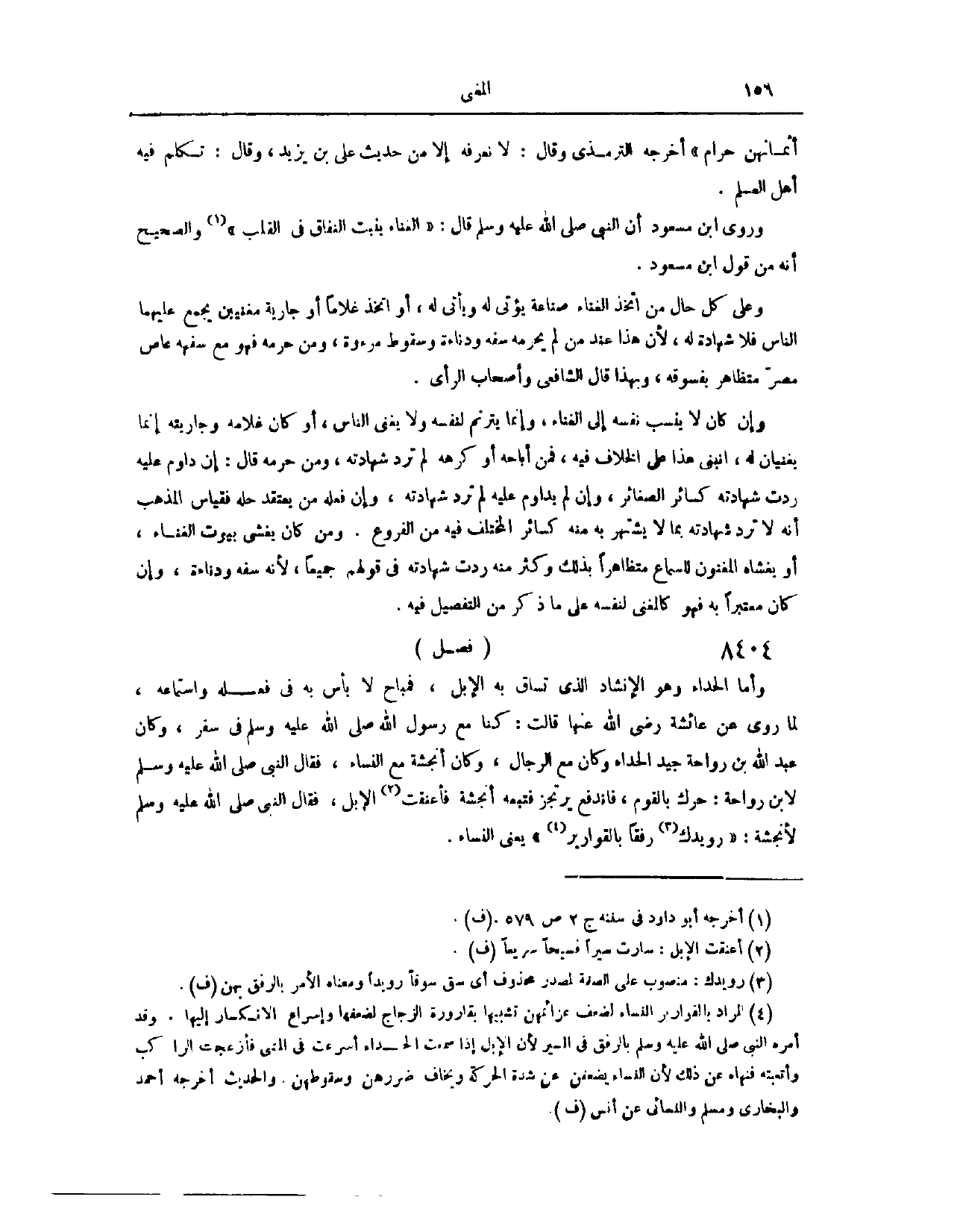 (٨٣٦٧) فَصْلٌ: فَأَمَّا الْحِدَاءُ، وَهُوَ الْإِنْشَادُ الَّذِي تُسَاقُ بِهِ الْإِبِلُ، فَمُبَاحٌ، لَا بَأْسَ بِهِ فِي فِعْلِهِ وَاسْتِمَاعِهِ؛ لِمَا رُوِيَ عَنْ عَائِشَةَ - رَضِيَ اللَّهُ عَنْهَا - قَالَتْ: «كُنَّا مَعَ رَسُولِ اللَّهِ - صَلَّى اللَّهُ عَلَيْهِ وَسَلَّمَ - فِي سَفَرٍ، وَكَانَ عَبْدُ اللَّهِ بْنُ رَوَاحَةَ جَيِّدَ الْحِدَاءِ، وَكَانَ مَعَ الرِّجَالِ، وَكَانَ أَنْجَشَةُ مَعَ النِّسَاءِ، فَقَالَ النَّبِيُّ - صَلَّى اللَّهُ عَلَيْهِ وَسَلَّمَ - لِابْنِ رَوَاحَةَ: حَرِّكْ بِالْقَوْمِ. فَانْدَفَعَ يَرْتَجِزُ، فَتَبِعَهُ أَنْجَشَةُ، فَأَعْنَقَتْ الْإِبِلُ، فَقَالَ النَّبِيُّ - صَلَّى اللَّهُ عَلَيْهِ وَسَلَّمَ - لِأَنْجَشَةَ: رُوَيْدَكَ، رِفْقًا بِالْقَوَارِيرِ» .