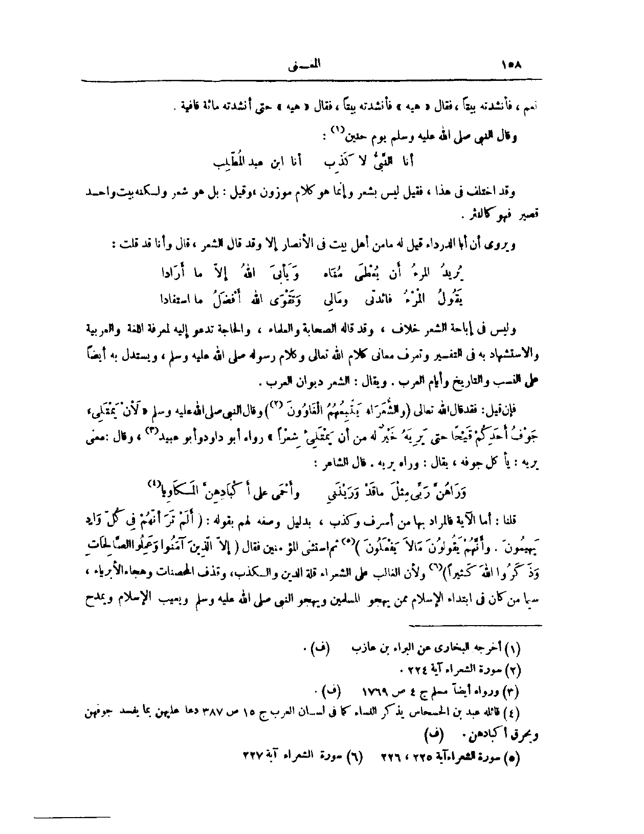 نَعَمْ. فَأَنْشَدْتُهُ بَيْتًا، فَقَالَ: هِيهِ. فَأَنْشَدْته بَيْتًا، فَقَالَ: هِيهِ. حَتَّى أَنْشَدْته مِائَةَ قَافِيَةٍ» . وَقَالَ النَّبِيُّ - صَلَّى اللَّهُ عَلَيْهِ وَسَلَّمَ - يَوْمَ حُنَيْنٍ: «أَنَا النَّبِيُّ لَا كَذِبْ أَنَا ابْنُ عَبْدِ الْمُطَّلِبْ» وَقَدْ اُخْتُلِفَ فِي هَذَا، فَقِيلَ: لَيْسَ بِشِعْرٍ، وَإِنَّمَا هُوَ كَلَامٌ مَوْزُونٌ. وَقِيلَ: بَلْ هُوَ شِعْرٌ، وَلَكِنَّهُ بَيْتٌ وَاحِدٌ قَصِيرٌ، فَهُوَ كَالنَّثْرِ.