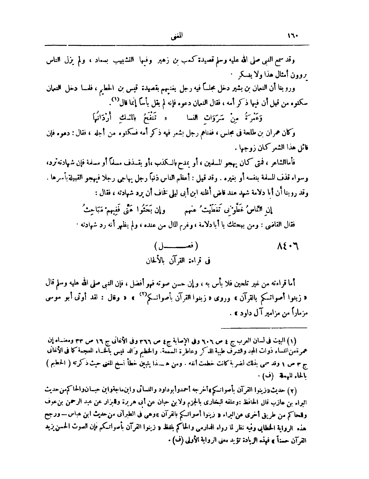 (٨٣٦٩) فَصْلٌ: فِي قِرَاءَةِ الْقُرْآنِ بِالْأَلْحَانِ: أَمَّا قِرَاءَتُهُ مِنْ غَيْرِ تَلْحِينٍ، فَلَا بَأْسَ بِهِ، وَإِنْ حَسَّنَ صَوْتَهُ، فَهُوَ أَفْضَلُ، فَإِنَّ النَّبِيَّ - صَلَّى اللَّهُ عَلَيْهِ وَسَلَّمَ -، قَالَ: «زَيِّنُوا أَصْوَاتَكُمْ بِالْقُرْآنِ» . وَرُوِيَ: «زَيِّنُوا الْقُرْآنَ بِأَصْوَاتِكُمْ» . وَقَالَ: «لَقَدْ أُوتِيَ أَبُو مُوسَى مِزْمَارًا مِنْ مَزَامِيرِ آلِ دَاوُد» .