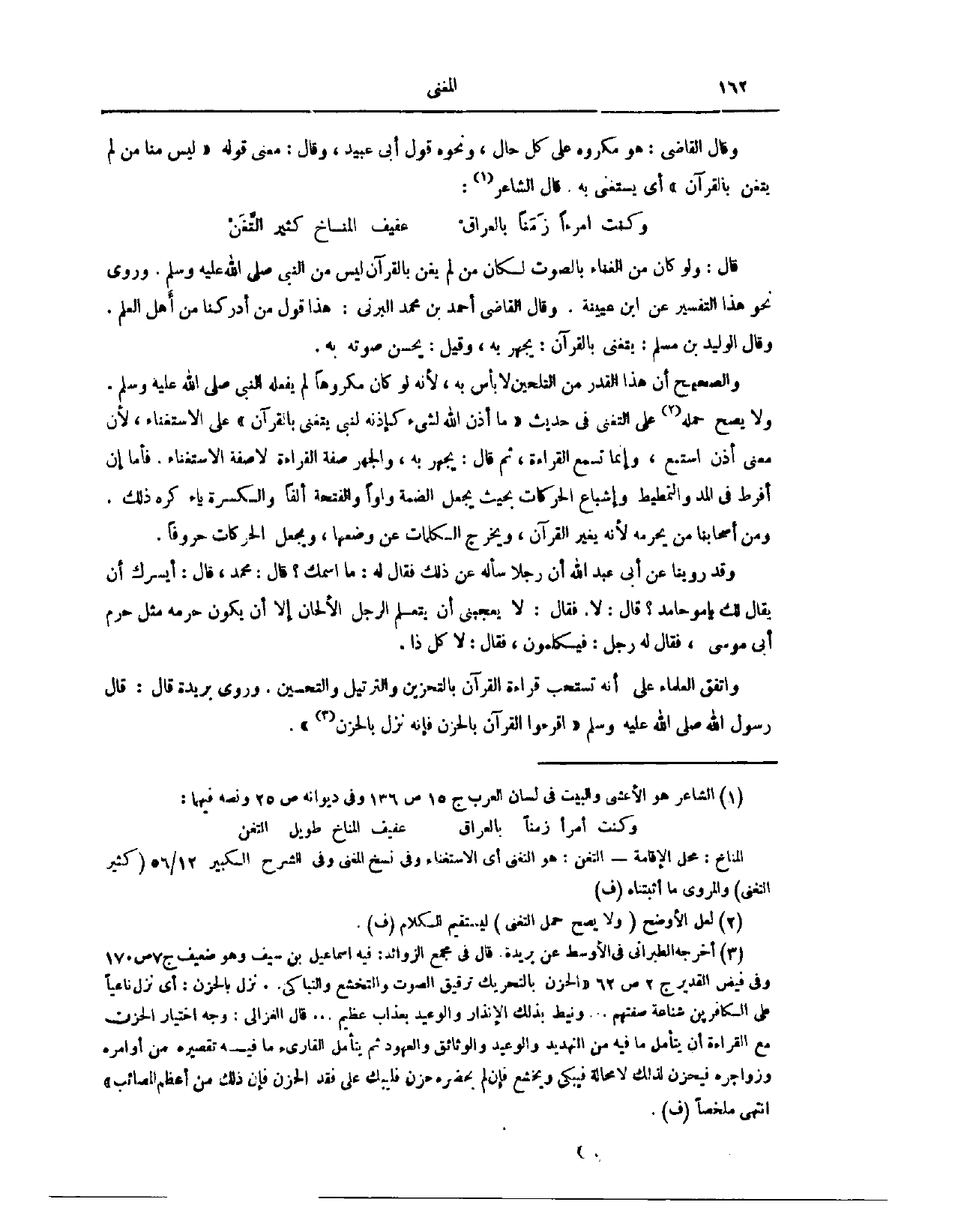 وَقَالَ الْقَاضِي: هُوَ مَكْرُوهٌ عَلَى كُلِّ حَالٍ. وَنَحْوُهُ قَوْلُ أَبِي عُبَيْدٍ، وَقَالَ مَعْنَى قَوْلِهِ: «لَيْسَ مِنَّا مَنْ لَمْ يَتَغَنَّ بِالْقُرْآنِ» . أَيْ: يَسْتَغْنِي بِهِ. قَالَ الشَّاعِرُ: