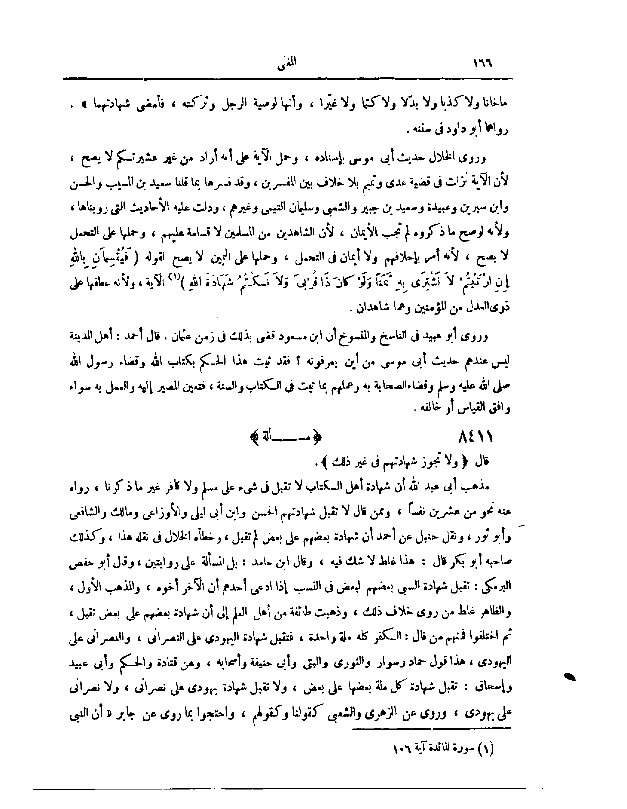 (٨٣٧٤) مَسْأَلَةٌ؛ قَالَ: (وَلَا تَجُوزُ شَهَادَتُهُمْ فِي غَيْرِ ذَلِكَ) مَذْهَبُ أَبِي عَبْدِ اللَّهِ أَنَّ شَهَادَةَ أَهْلِ الْكِتَابِ لَا تُقْبَلُ فِي شَيْءٍ عَلَى مُسْلِمٍ وَلَا كَافِرٍ غَيْرِ مَا ذَكَرْنَا. رَوَاهُ عَنْهُ نَحْوٌ مِنْ عِشْرِينَ نَفْسًا. وَمِمَّنْ قَالَ: لَا تُقْبَلُ شَهَادَتُهُمْ؛ الْحَسَنُ، وَابْنُ أَبِي لَيْلَى، وَالْأَوْزَاعِيُّ، وَمَالِكٌ، وَالشَّافِعِيُّ، وَأَبُو ثَوْرٍ. وَنَقَلَ حَنْبَلٌ، عَنْ أَحْمَدَ، أَنَّ شَهَادَةَ بَعْضِهِمْ عَلَى بَعْضٍ لَمْ تُقْبَلُ. وَخَطَّأَهُ الْخَلَّالُ فِي نَقْلِهِ هَذَا، وَكَذَلِكَ صَاحِبُهُ أَبُو بَكْرٍ، قَالَ: هَذَا غَلَطٌ لَا شَكَّ فِيهِ.
