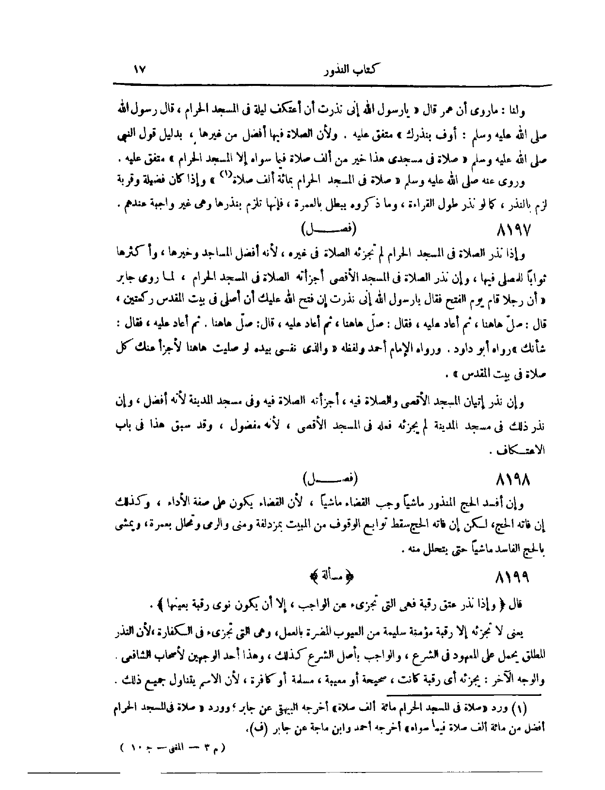 (٨١٨٨) فَصْلٌ: وَإِذَا نَذَرَ الصَّلَاةَ فِي الْمَسْجِدِ الْحَرَامِ، لَمْ تُجْزِئْهُ الصَّلَاةُ فِي غَيْرِهِ لِأَنَّهُ أَفْضَلُ الْمَسَاجِدِ وَخَيْرُهَا، وَأَكْثَرُهَا ثَوَابًا لِلْمُصَلِّي فِيهَا. وَإِنْ نَذَرَ الصَّلَاةَ فِي الْمَسْجِدِ الْأَقْصَى، أَجْزَأَتْهُ الصَّلَاةُ فِي الْمَسْجِدِ الْحَرَامِ؛ لِمَا رَوَى جَابِرٌ، أَنَّ «رَجُلًا يَوْمَ الْفَتْحِ، فَقَالَ: يَا رَسُولَ اللَّهِ، إنِّي نَذَرْت إنْ فَتَحَ اللَّهُ عَلَيْك أَنْ أُصَلِّيَ فِي بَيْتِ الْمَقْدِسِ رَكْعَتَيْنِ. قَالَ: صَلِّ هَاهُنَا. ثُمَّ أَعَادَ عَلَيْهِ، فَقَالَ: صَلِّ هَاهُنَا. ثُمَّ أَعَادَ عَلَيْهِ، قَالَ: صَلِّ هَاهُنَا. ثُمَّ أَعَادَ عَلَيْهِ، فَقَالَ: شَأْنُك» رَوَاهُ أَبُو دَاوُد، وَرَوَاهُ الْإِمَامُ أَحْمَدُ، وَلَفْظُهُ «وَاَلَّذِي نَفْسِي بِيَدِهِ، لَوْ صَلَّيْت هَا هُنَا لَأَجْزَأَ عَنْك كُلَّ صَلَاةٍ فِي بَيْتِ الْمَقْدِسِ» . وَإِنْ نَذَرَ إتْيَانَ الْمَسْجِدِ الْأَقْصَى، وَالصَّلَاةَ فِيهِ، أَجْزَأَتْهُ الصَّلَاةُ فِيهِ، وَفِي مَسْجِدِ الْمَدِينَةِ؛ لِأَنَّهُ أَفْضَلُ. وَإِنْ نَذَرَ ذَلِكَ فِي مَسْجِدِ الْمَدِينَةِ، لَمْ يُجْزِئْهُ فِعْلُهُ فِي الْمَسْجِدِ الْأَقْصَى؛ لِأَنَّهُ مَفْضُولٌ. وَقَدْ سَبَقَ هَذَا فِي بَابِ الِاعْتِكَافِ.