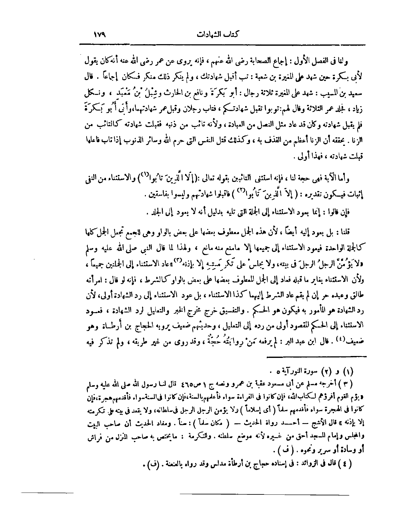 قَالَ سَعِيدُ بْنُ الْمُسَيِّبِ: شَهِدَ عَلَى الْمُغِيرَةِ ثَلَاثَةُ رِجَالٍ؛ أَبُو بَكْرَةَ، وَنَافِعُ بْنُ الْحَارِثِ، وَشِبْلُ بْنُ مَعْبَدٍ، وَنَكَلَ زِيَادٌ، فَجَلَدَ عُمَرُ الثَّلَاثَةَ، وَقَالَ لَهُمْ: تُوبُوا، تُقْبَلْ شَهَادَتُكُمْ. فَتَابَ رَجُلَانِ، وَقَبِلَ عُمَرُ شَهَادَتَهُمَا، وَأَبِي أَبُو بَكْرَةَ، فَلَمْ يَقْبَلْ شَهَادَتَهُ. وَكَانَ قَدْ عَادَ مِثْلَ النَّصْلِ مِنْ الْعِبَادَةِ. وَلِأَنَّهُ تَابَ مِنْ ذَنْبِهِ، فَقُبِلَتْ شَهَادَتُهُ، كَالتَّائِبِ مِنْ الزِّنَى، يُحَقِّقُهُ أَنَّ الزِّنَى أَعْظَمُ مِنْ الْقَذْفِ بِهِ، وَكَذَلِكَ قَتْلُ النَّفْسِ الَّتِي حَرَّمَ اللَّهُ، وَسَائِرُ الذُّنُوبِ، إذَا تَابَ فَاعِلُهَا، قُبِلَتْ شَهَادَتُهُ، فَهَذَا أَوْلَى.