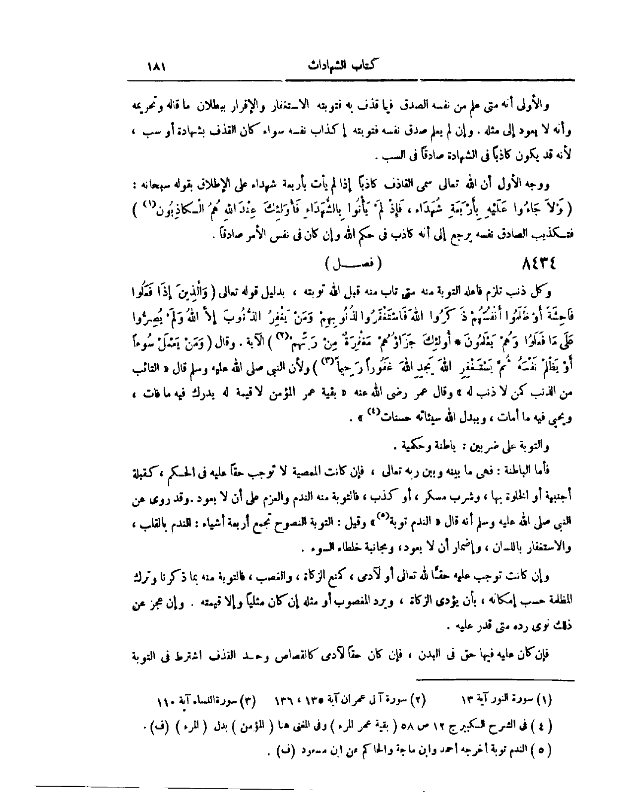 وَقَالَ: {وَمَنْ يَعْمَلْ سُوءًا أَوْ يَظْلِمْ نَفْسَهُ ثُمَّ يَسْتَغْفِرِ اللَّهَ يَجِدِ اللَّهَ غَفُورًا رَحِيمًا} [النساء: ١١٠] . وَلِأَنَّ النَّبِيَّ - صَلَّى اللَّهُ عَلَيْهِ وَسَلَّمَ - قَالَ: «التَّائِبُ مِنْ الذَّنْبِ كَمَنْ لَا ذَنْبَ لَهُ» . وَقَالَ عُمَرُ - رَضِيَ اللَّهُ عَنْهُ -: بَقِيَّةُ عُمْرِ الْمُؤْمِنِ لَا قِيمَةَ لَهُ، يُدْرِكُ فِيهِ مَا فَاتَ، وَيُحْيِي فِيهِ مَا أَمَاتَ، وَيُبَدِّلُ اللَّهُ سَيِّئَاتِهِ حَسَنَاتٍ. وَالتَّوْبَةُ عَلَى ضَرْبَيْنِ؛ بَاطِنَةٌ، وَحُكْمِيَّةٌ، فَأَمَّا الْبَاطِنَةُ، فَهِيَ مَا بَيْنَهُ وَبَيْنَ رَبِّهِ تَعَالَى، فَإِنْ كَانَتْ الْمَعْصِيَةُ لَا تُوجِبُ حَقًّا عَلَيْهِ فِي الْحُكْمِ، كَقُبْلَةِ أَجْنَبِيَّةٍ، أَوْ الْخَلْوَةِ بِهَا، وَشُرْبِ مُسْكِرٍ، أَوْ كَذِبٍ، فَالتَّوْبَةُ مِنْهُ النَّدَمُ، وَالْعَزْمُ عَلَى أَنْ لَا يَعُودَ.