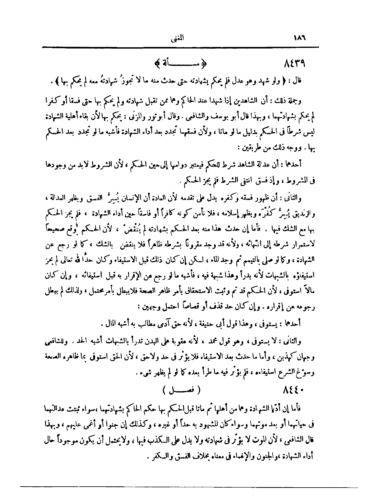 (٨٤٠٦) فَصْلٌ: فَأَمَّا إنْ أَدَّيَا الشَّهَادَةَ، وَهُمَا مِنْ أَهْلِهَا، ثُمَّ مَاتَا قَبْلَ الْحُكْمِ بِهَا، حَكَمَ الْحَاكِمُ بِشَهَادَتِهِمَا، سَوَاءٌ ثَبَتَتْ عَدَالَتُهُمَا فِي حَيَاتِهِمَا، أَوْ بَعْدَ مَوْتِهِمَا، وَسَوَاءٌ كَانَ الْمَشْهُودُ بِهِ حَدًّا أَوْ غَيْرَهُ. وَكَذَلِكَ إنْ جُنُّوا، أَوْ أُغْمِيَ عَلَيْهِمْ. وَبِهَذَا قَالَ الشَّافِعِيُّ؛ لِأَنَّ الْمَوْتَ لَا يُؤَثِّرُ فِي شَهَادَتِهِ، وَلَا يَدُلُّ عَلَى الْكَذِبِ فِيهَا. وَلَا يَحْتَمِلُ أَنْ يَكُونَ مَوْجُودًا حَالَ أَدَاءِ الشَّهَادَةِ، وَالْجُنُونُ وَالْإِغْمَاءُ فِي مَعْنَاهُ، بِخِلَافِ الْفِسْقِ وَالْكُفْرِ.
