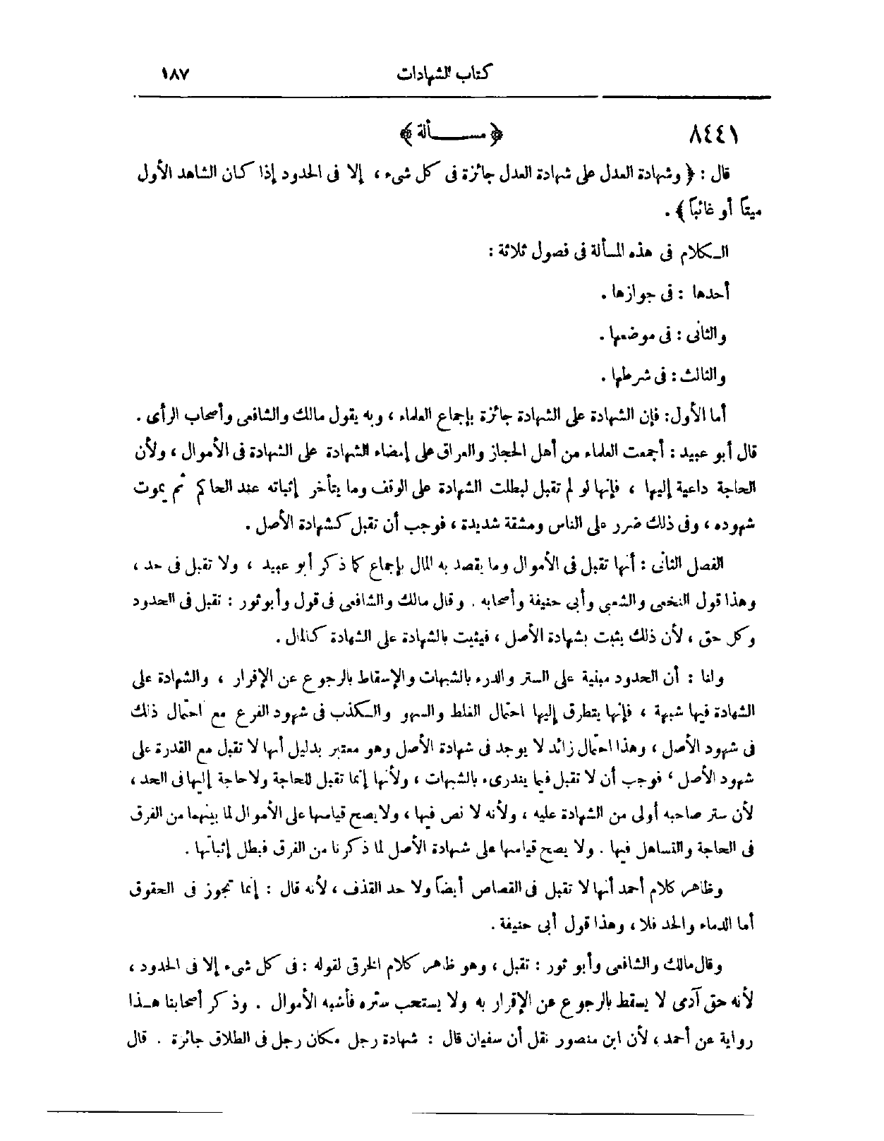 (٨٤٠٧) مَسْأَلَةٌ؛ قَالَ: (وَشَهَادَةُ الْعَدْلِ عَلَى شَهَادَةِ الْعَدْلِ جَائِزَةٌ فِي كُلِّ شَيْءٍ، إلَّا فِي الْحُدُودِ، إذَا كَانَ الشَّاهِدُ الْأَوَّلُ مَيِّتًا أَوْ غَائِبًا) . الْكَلَامُ فِي هَذِهِ الْمَسْأَلَةِ فِي فُصُولٍ ثَلَاثَةٍ؛ (٨٤٠٨) الْفَصْلُ الْأَوَّلُ، فِي جَوَازِهَا.