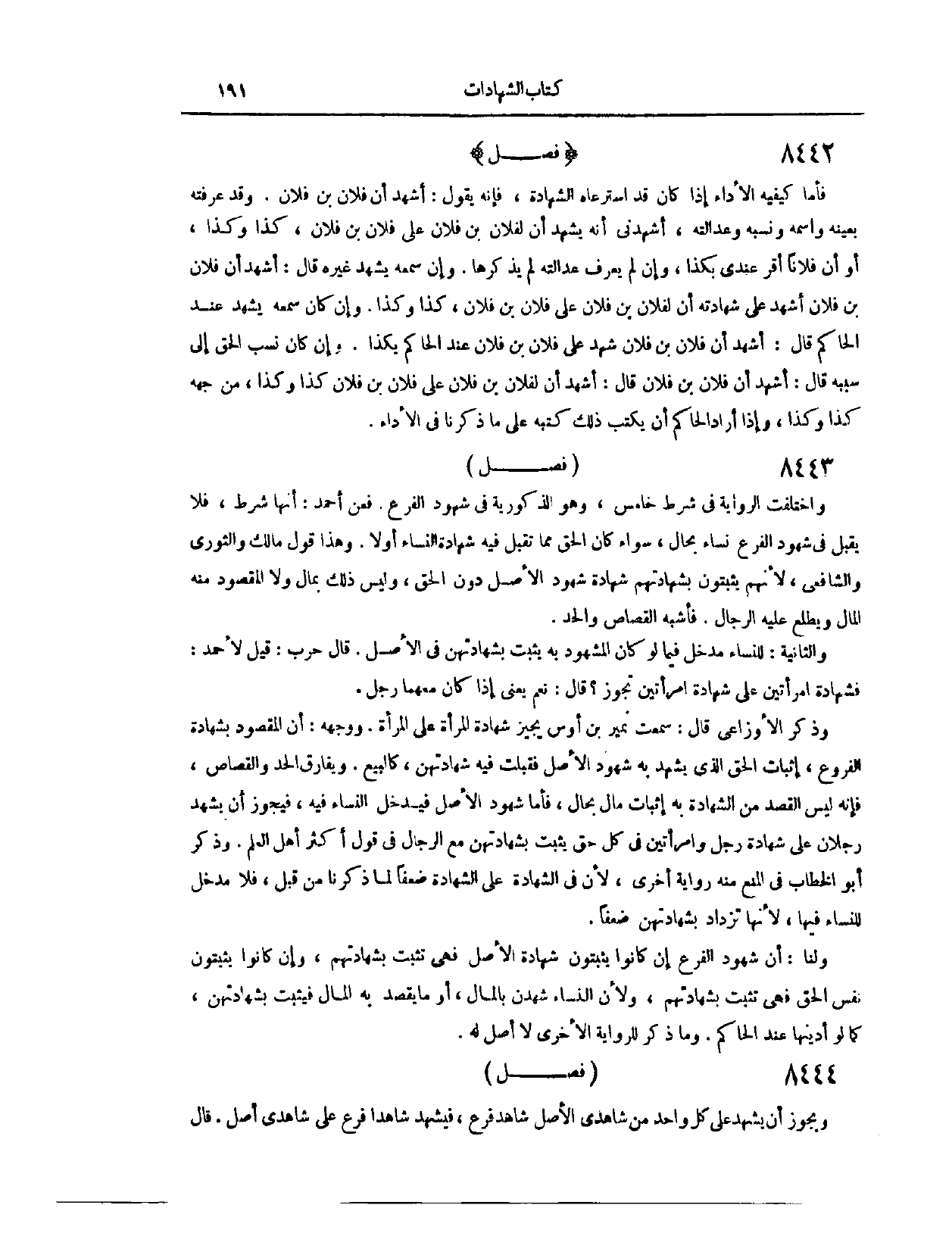(٨٤١٢) فَصْلٌ: وَاخْتَلَفَتْ الرِّوَايَةُ فِي شَرْطٍ خَامِسٍ، وَهُوَ الذُّكُورِيَّةُ فِي شُهُودِ الْفَرْعِ؛ فَعَنْ أَحْمَدَ، أَنَّهَا شَرْطٌ، فَلَا يُقْبَلُ فِي شُهُودِ الْفَرْعِ نِسَاءٌ بِحَالٍ، سَوَاءٌ كَانَ الْحَقُّ مِمَّا تُقْبَلُ فِيهِ شَهَادَةُ النِّسَاءِ، أَوْ لَا. وَهَذَا قَوْلُ مَالِكٍ، وَالثَّوْرِيِّ، وَالشَّافِعِيِّ؛ لِأَنَّهُمْ يُثْبِتُونَ بِشَهَادَتِهِمْ شَهَادَةَ شُهُودِ الْأَصْلِ دُونَ الْحَقِّ وَلَيْسَ ذَلِكَ بِمَالٍ، وَلَا الْمَقْصُودُ مِنْهُ الْمَالُ، وَيَطَّلِعُ عَلَيْهِ الرِّجَالُ، فَأَشْبَهَ الْقِصَاصَ وَالْحَدَّ.