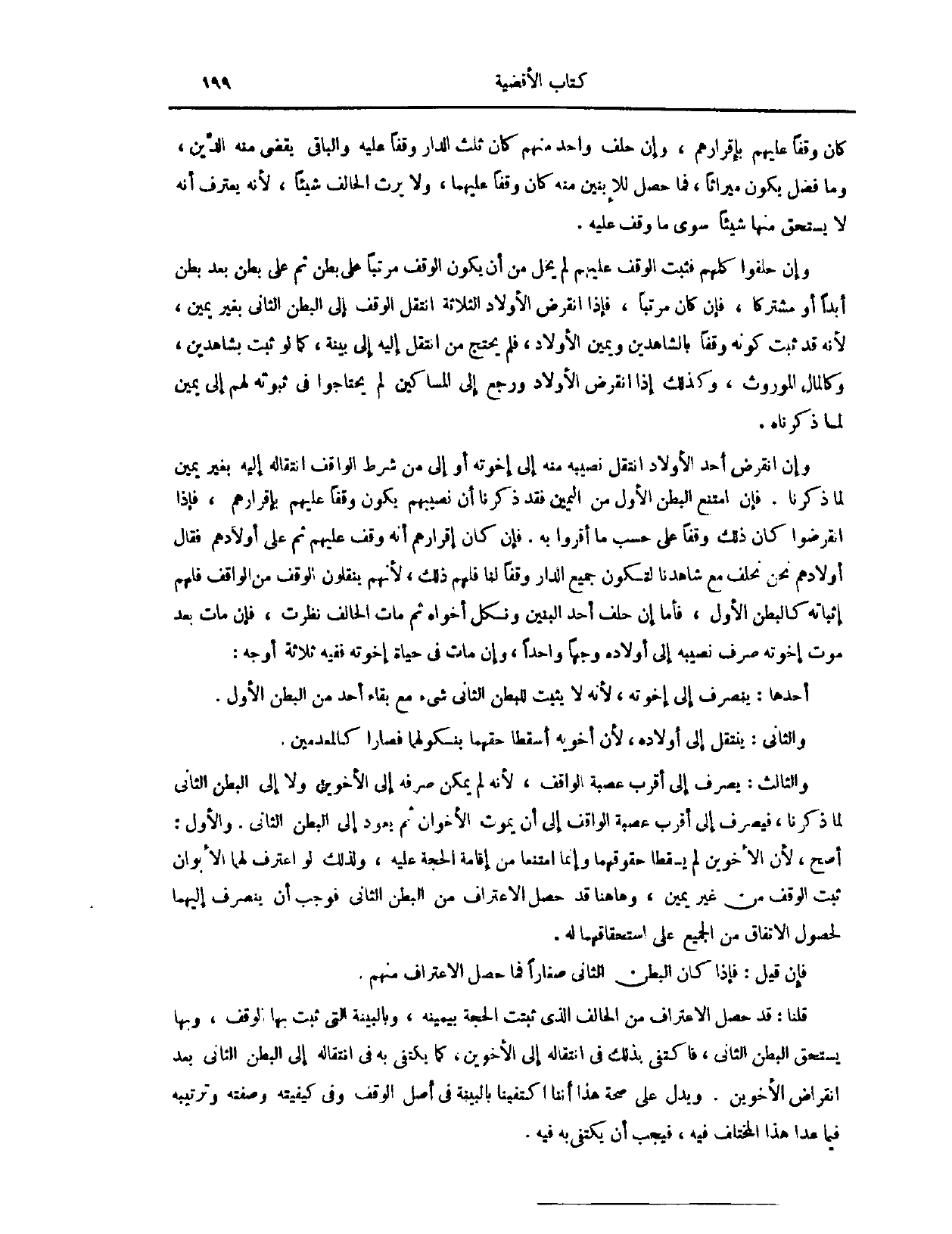 كَانَ وَقْفًا عَلَيْهِمْ بِإِقْرَارِهِمْ. وَإِنْ حَلَفَ وَاحِدٌ مِنْهُمْ كَانَ ثُلُثُ الدَّارِ وَقْفًا عَلَيْهِ، وَالْبَاقِي يَقْضِي مِنْهُ الدَّيْنَ وَمَا فَضَلَ يَكُونُ مِيرَاثًا، فَمَا حَصَلَ لِلِابْنَيْنِ مِنْهُ كَانَ وَقْفًا عَلَيْهِمَا، وَلَا يَرِثُ الْحَالِفُ شَيْئًا؛ لِأَنَّهُ يَعْتَرِفُ أَنَّهُ لَا يَسْتَحِقُّ مِنْهَا شَيْئًا سِوَى مَا وُقِفَ عَلَيْهِ. وَإِنْ حَلَفُوا كُلُّهُمْ، فَثَبَتَ الْوَقْفُ عَلَيْهِمْ، لَمْ يَخْلُ مِنْ أَنْ يَكُونَ الْوَقْفُ مُرَتَّبًا عَلَى بَطْنٍ، ثُمَّ عَلَى بَطْنٍ بَعْدَ بَطْنٍ أَبَدًا، أَوْ مُشْتَرَكًا، فَإِنْ كَانَ مُرَتَّبًا، فَإِذَا انْقَرَضَ الْأَوْلَادُ الثَّلَاثَةُ، انْتَقَلَ الْوَقْفُ إلَى الْبَطْنِ الثَّانِي، بِغَيْرِ يَمِينٍ؛ لِأَنَّهُ قَدْ ثَبَتَ كَوْنُهُ وَقْفًا بِالشَّاهِدَيْنِ وَيَمِينِ الْأَوْلَادِ، فَلَمْ يَحْتَجْ مِنْ انْتَقَلَ إلَيْهِ إلَى بَيِّنَةٍ، كَمَا لَوْ ثَبَتَ بِشَاهِدَيْنِ، وَكَالْمَالِ الْمَوْرُوثِ.