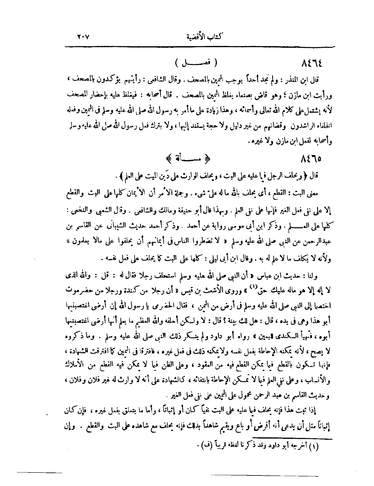 (٨٤٣٣) فَصْلٌ: قَالَ ابْنُ الْمُنْذِرِ: لَمْ نَجِدْ أَحَدًا يُوجِبُ الْيَمِينَ بِالْمُصْحَفِ. وَقَالَ الشَّافِعِيُّ: رَأَيْتُهُمْ يُؤَكِّدُونَ بِالْمُصْحَفِ، وَرَأَيْت ابْنَ مَازِنٍ، وَهُوَ قَاضٍ بِصَنْعَاءَ، يُغَلِّظُ الْيَمِينَ بِالْمُصْحَفِ. قَالَ أَصْحَابُهُ: فَيُغَلِّظُ عَلَيْهِ بِإِحْضَارِ الْمُصْحَفِ؛ لِأَنَّهُ يَشْتَمِلُ عَلَى كَلَامِ اللَّهِ تَعَالَى وَأَسْمَائِهِ. وَهَذَا زِيَادَةٌ عَلَى مَا أَمَرَ بِهِ رَسُولُ اللَّهِ - صَلَّى اللَّهُ عَلَيْهِ وَسَلَّمَ - فِي الْيَمِينِ، وَفَعَلَهُ الْخُلَفَاءُ الرَّاشِدُونَ وَقُضَاتُهُمْ، مِنْ غَيْرِ دَلِيلٍ وَلَا حُجَّةٍ يُسْتَنَدُ إلَيْهَا، وَلَا يُتْرَكُ فِعْلُ رَسُولِ اللَّهِ - صَلَّى اللَّهُ عَلَيْهِ وَسَلَّمَ - وَأَصْحَابِهِ لِفِعْلِ ابْنِ مَازِنٍ وَلَا غَيْرِهِ.