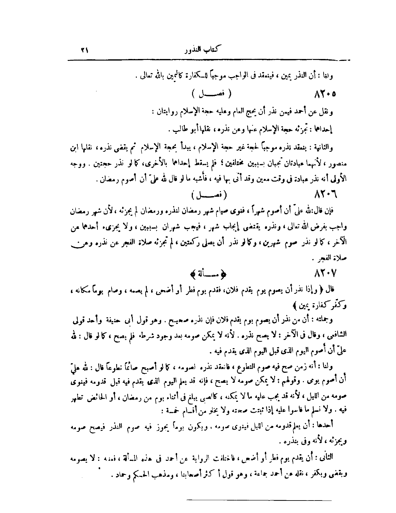 (٨١٩٦) فَصْلٌ: وَنُقِلَ عَنْ أَحْمَدَ، فِيمَنْ نَذَرَ أَنْ يَحُجَّ الْعَامَ، وَعَلَيْهِ حِجَّةُ الْإِسْلَامِ، رِوَايَتَانِ؛ إحْدَاهُمَا، تُجْزِئُهُ حِجَّةُ الْإِسْلَامِ عَنْهَا وَعَنْ نَذْرِهِ. نَقَلَهَا أَبُو طَالِبٍ. وَالثَّانِيَةُ، يَنْعَقِدُ نَذْرُهُ مُوجِبًا لِحِجَّةٍ غَيْرِ حِجَّةِ الْإِسْلَامِ يَبْدَأُ بِحِجَّةِ الْإِسْلَامِ، ثُمَّ يَقْضِي نَذْرَهُ. نَقَلَهَا ابْنُ مَنْصُورٍ؛ لِأَنَّهُمَا عِبَادَتَانِ تَجِبَانِ بِسَبَبَيْنِ مُخْتَلِفَيْنِ، فَلَمْ تَسْقُطْ إحْدَاهُمَا بِالْأُخْرَى، كَمَا لَوْ نَذَرَ حِجَّتَيْنِ، وَوَجْهُ الْأُولَى، أَنَّهُ نَذَرَ عِبَادَةً فِي وَقْتٍ مُعَيَّنٍ، وَقَدْ أَتَى بِهَا فِيهِ، فَأَشْبَهَ مَا لَوْ قَالَ: لِلَّهِ عَلَيَّ أَنْ أَصُومَ رَمَضَانَ.