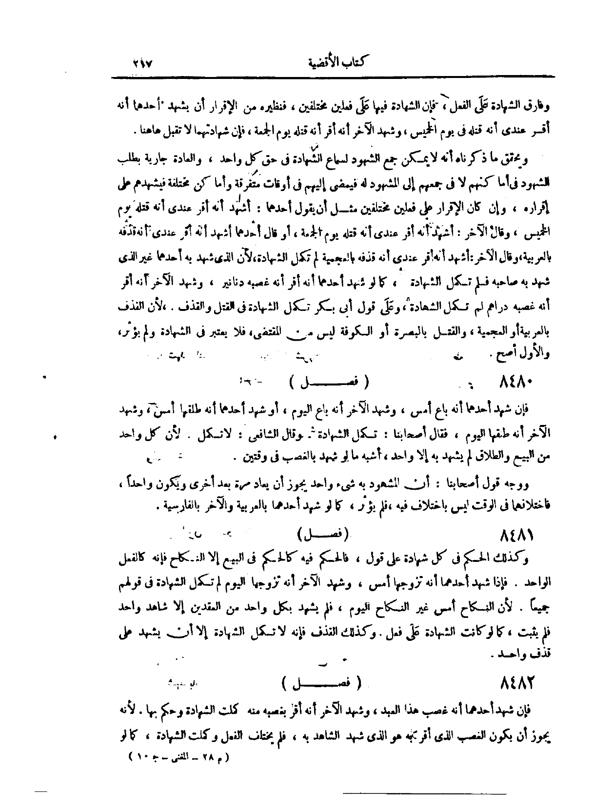 فَصْلٌ: وَكَذَلِكَ الْحُكْمُ فِي كُلِّ شَهَادَةٍ عَلَى قَوْلٍ، فَالْحُكْمُ فِيهِ كَالْحُكْمِ فِي الْبَيْعِ إلَّا النِّكَاحَ فَإِنَّهُ كَالْفِعْلِ الْوَاحِدِ. فَإِذَا شَهِدَ أَحَدُهُمَا أَنَّهُ تَزَوَّجَهَا أَمْسِ، وَشَهِدَ الْآخَرُ أَنَّهُ تَزَوَّجَهَا الْيَوْمَ، لَمْ تَكْمُلْ الشَّهَادَةُ، فِي قَوْلِهِمْ جَمِيعًا؛ لِأَنَّ النِّكَاحَ أَمْسِ غَيْرُ النِّكَاحِ الْيَوْمَ، فَلَمْ يَشْهَدْ بِكُلِّ وَاحِدٍ مِنْ الْعَقْدَيْنِ إلَّا شَاهِدٌ وَاحِدٌ، فَلَمْ يَثْبُتْ، كَمَا لَوْ كَانَتْ الشَّهَادَةُ عَلَى فِعْلٍ، وَكَذَلِكَ الْقَذْفُ، فَإِنَّهُ لَا تَكْمُلُ الشَّهَادَةُ إلَّا أَنْ يَشْهَدَا عَلَى قَذْفٍ وَاحِدٍ.