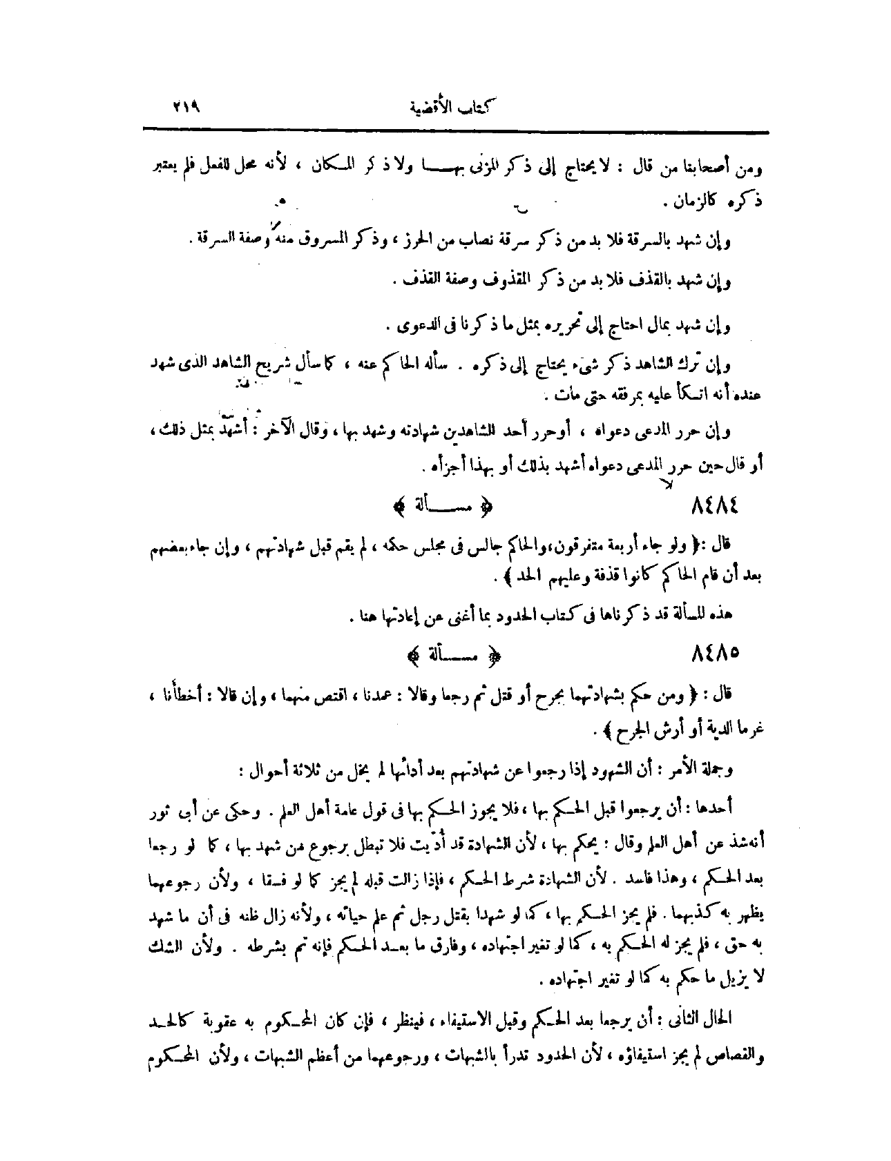 (٨٤٥٣) مَسْأَلَةٌ؛ قَالَ: (وَلَوْ جَاءَ أَرْبَعَةٌ مُتَفَرِّقُونَ، وَالْحَاكِمُ جَالِسٌ فِي مَجْلِسِ حُكْمِهِ، لَمْ يَقُمْ قَبْلَ شَهَادَتِهِمْ. وَإِنْ جَاءَ بَعْضُهُمْ بَعْدَ أَنْ قَامَ الْحَاكِمُ، كَانُوا قَذَفَةً، وَعَلَيْهِمْ الْحَدُّ) هَذِهِ الْمَسْأَلَةُ؛ قَدْ ذَكَرْنَاهَا فِي كِتَابِ الْحُدُودِ، بِمَا أَغْنَى عَنْ إعَادَتِهَا هَاهُنَا.