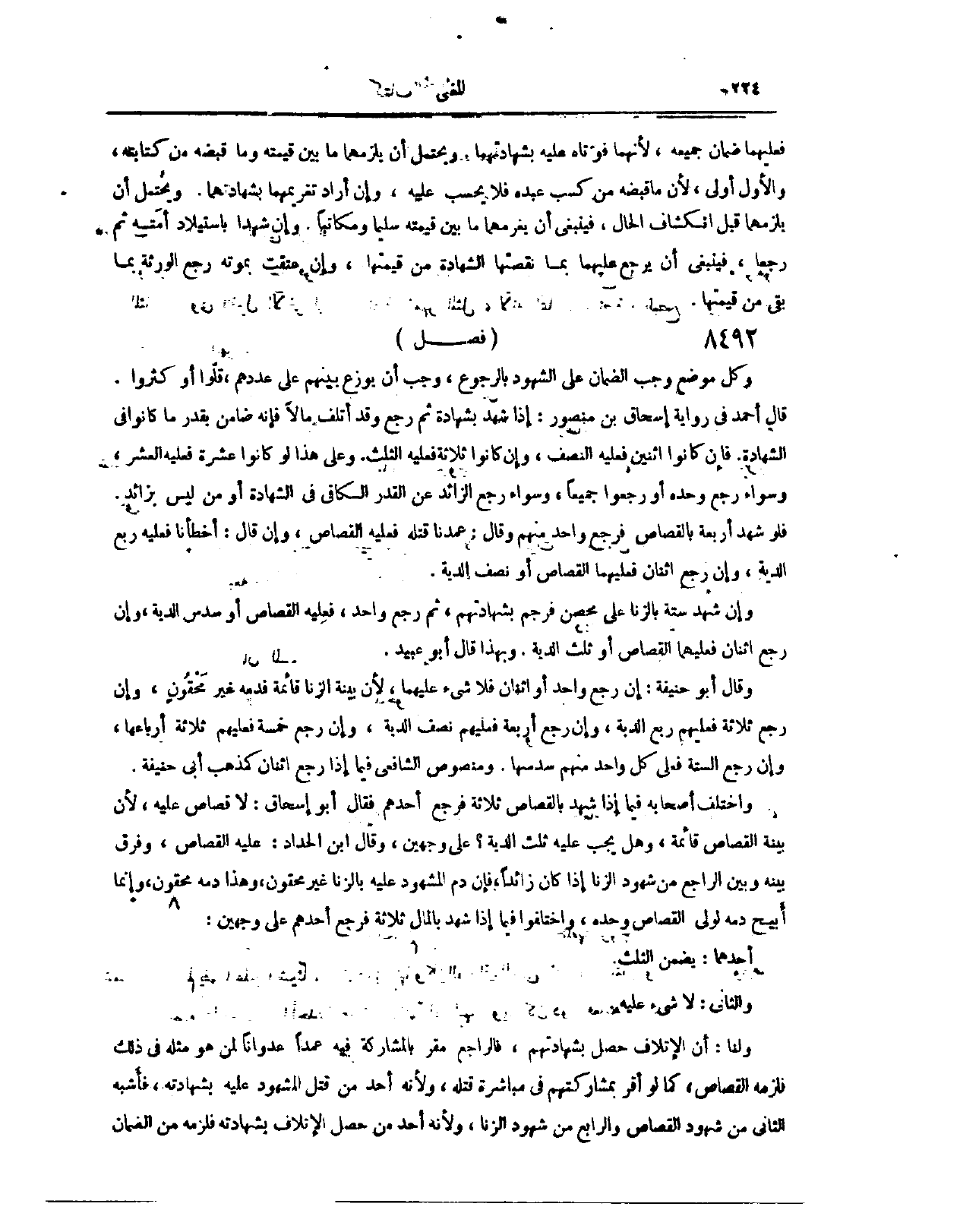 (٨٤٦١) فَصْلٌ: وَكُلُّ مَوْضِعٍ وَجَبَ الضَّمَانُ عَلَى الشُّهُودِ بِالرُّجُوعِ، وَجَبَ أَنْ يُوَزَّعَ بَيْنَهُمْ عَلَى عَدَدِهِمْ، قَلُّوا أَوْ كَثُرُوا. قَالَ أَحْمَدُ، فِي رِوَايَةِ إِسْحَاقَ بْنِ مَنْصُورٍ: إذَا شَهِدَ بِشَهَادَةِ، ثُمَّ رَجَعَ وَقَدْ أَتْلَفَ مَالًا، فَإِنَّهُ ضَامِنٌ بِقَدْرِ مَا كَانُوا فِي الشَّهَادَةِ، فَإِنْ كَانُوا اثْنَيْنِ، فَعَلَيْهِ النِّصْفُ، وَإِنْ كَانُوا ثَلَاثَةً، فَعَلَيْهِ الثُّلُثُ. وَعَلَى هَذَا لَوْ كَانُوا عَشَرَةً، فَعَلَيْهِ الْعُشْرُ، وَسَوَاءٌ رَجَعَ وَحْدَهُ، أَوْ رَجَعُوا جَمِيعًا، وَسَوَاءٌ رَجَعَ الزَّائِدُ عَنْ الْقَدْرِ الْكَافِي فِي الشَّهَادَةِ، أَوْ مَنْ لَيْسَ بِزَائِدٍ، فَلَوْ شَهِدَ أَرْبَعَةٌ بِالْقِصَاصِ، فَرَجَعَ وَاحِدٌ مِنْهُمْ، وَقَالَ: عَمَدْنَا قَتْلَهُ. فَعَلَيْهِ الْقِصَاصُ.