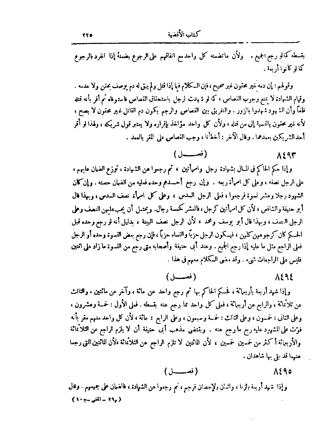 (٨٤٦٣) فَصْلٌ: وَإِذَا شَهِدَ أَرْبَعَةٌ بِأَرْبَعِمِائَةٍ، فَحَكَمَ الْحَاكِمُ بِهَا، ثُمَّ رَجَعَ وَاحِدٌ عَنْ مِائَةٍ، وَآخَرُ عَنْ مِائَتَيْنِ، وَالثَّالِثُ عَنْ ثَلَاثِمِائَةٍ، وَالرَّابِعُ عَنْ أَرْبَعِمِائَةٍ، فَعَلَى كُلِّ وَاحِدٍ مِمَّا رَجَعَ عَنْهُ بِقِسْطِهِ؛ فَعَلَى الْأَوَّلِ خَمْسَةٌ وَعِشْرُونَ، وَعَلَى الثَّانِي خَمْسُونَ، وَعَلَى الثَّالِثِ: خَمْسَةٌ وَسَبْعُونَ، وَعَلَى الرَّابِعِ: مِائَةٌ؛ لِأَنَّ كُلَّ وَاحِدٍ مِنْهُمْ مُقِرٌّ بِأَنَّهُ فَوَّتَ عَلَى الْمَشْهُودِ عَلَيْهِ رُبْعَ مَا رَجَعَ عَنْهُ. وَيَقْتَضِي مَذْهَبُ أَبِي حَنِيفَةَ، أَنْ لَا يَلْزَمَ الرَّاجِعَ عَنْ الثَّلَاثِمِائَةِ وَالْأَرْبَعمِائَةِ أَكْثَرُ مِنْ خَمْسِينَ خَمْسِينَ؛ لِأَنَّ الْمِائَتَيْنِ لَا تَلْزَمُ الرَّاجِعَ عَنْ الثَّلَاثِمِائَةِ لِأَنَّ الْمِائَتَيْنِ الَّتِي رَجَعَا عَنْهُمَا قَدْ بَقِيَ بِهَا شَاهِدَانِ.