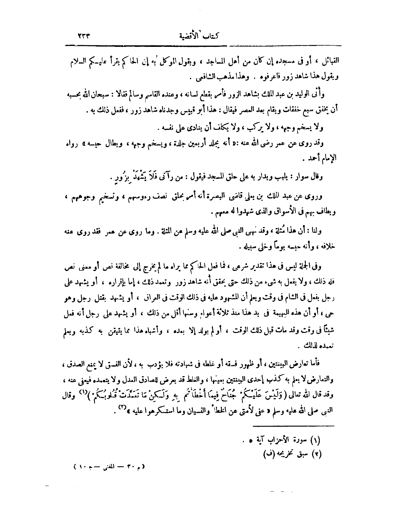 وَمَا رُوِيَ عَنْ عُمَرَ، فَقَدْ رُوِيَ عَنْهُ خِلَافُهُ، وَأَنَّهُ حَبَسَهُ يَوْمًا وَخَلَّى سَبِيلَهُ. وَفِي الْجُمْلَةِ لَيْسَ فِي هَذَا تَقْدِيرًا شَرْعِيًّا، فَمَا فَعَلَ الْحَاكِمُ مِمَّا يَرَاهُ، مَا لَمْ يَخْرُجْ إلَى مُخَالَفَةِ نَصٍّ أَوْ مَعْنَى نَصٍّ فَلَهُ ذَلِكَ، وَلَا يُفْعَلُ بِهِ شَيْءٌ مِنْ ذَلِكَ حَتَّى يُتَحَقَّقَ أَنَّهُ شَاهِدُ زُورٍ، وَتَعَمَّدَ ذَلِكَ، إمَّا بِإِقْرَارِهِ، أَوْ يَشْهَدُ عَلَى رَجُلٍ بِفِعْلٍ فِي الشَّامِ فِي وَقْتٍ، وَيُعْلَمُ أَنَّ الْمَشْهُودَ عَلَيْهِ فِي ذَلِكَ الْوَقْتِ فِي الْعِرَاقِ، أَوْ يَشْهَدُ بِقَتْلِ رَجُلٍ، وَهُوَ حَيٌّ، أَوْ أَنَّ هَذِهِ الْبَهِيمَةَ فِي يَدِ هَذَا مُنْذُ ثَلَاثَةِ أَعْوَامٍ. وَسِنُّهَا أَقَلُّ مِنْ ذَلِكَ، أَوْ يَشْهَدُ عَلَى رَجُلٍ أَنَّهُ فَعَلَ شَيْئًا فِي وَقْتٍ، وَقَدْ مَاتَ قَبْلَ ذَلِكَ الْوَقْتِ، أَوْ لَمْ يُولَدْ إلَّا بَعْدَهُ، وَأَشْبَاهِ هَذَا مِمَّا يُتَيَقَّنُ بِهِ كَذِبُهُ، وَيُعْلَمُ تَعَمُّدُهُ لِذَلِكَ.