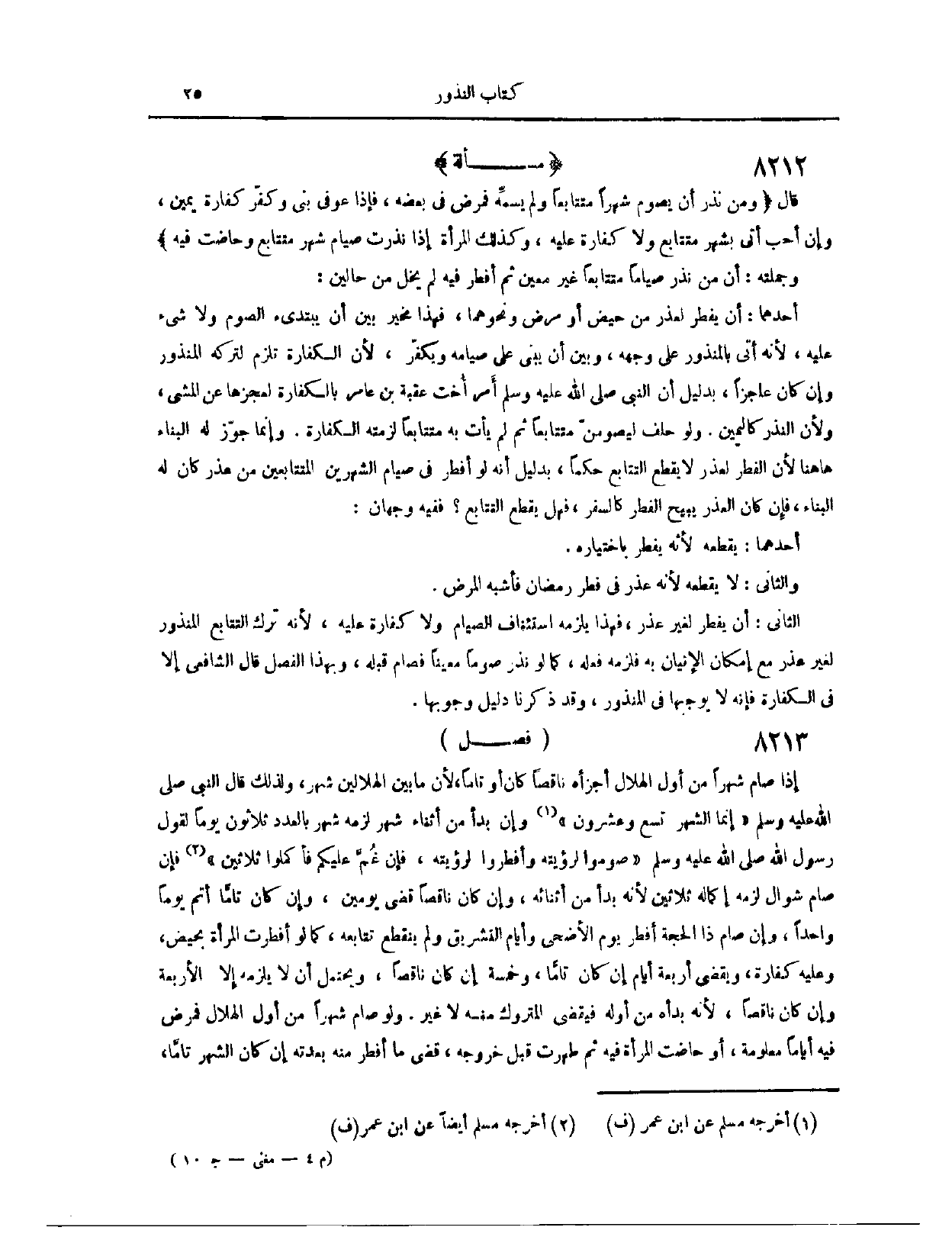 (٨٢٠٣) مَسْأَلَةٌ؛ قَالَ: (وَمَنْ نَذَرَ أَنْ يَصُومَ شَهْرًا مُتَتَابِعًا، وَلَمْ يُسَمِّهِ، فَمَرِضَ فِي بَعْضِهِ، فَإِذَا عُوفِيَ، بَنَى، وَكَفَّرَ كَفَّارَةَ يَمِينٍ، وَإِنْ أَحَبَّ أَتَى بِشَهْرٍ مُتَتَابِعٍ، وَلَا كَفَّارَةَ عَلَيْهِ، وَكَذَلِكَ الْمَرْأَةُ إذَا نَذَرَتْ صِيَامَ شَهْرٍ مُتَتَابِعٍ، وَحَاضَتْ فِيهِ) وَجُمْلَتُهُ أَنَّ مَنْ نَذَرَ صِيَامًا مُتَتَابِعًا غَيْرَ مُعَيَّنٍ، ثُمَّ أَفْطَرَ فِيهِ، لَمْ يَخْلُ مِنْ حَالَيْنِ.
